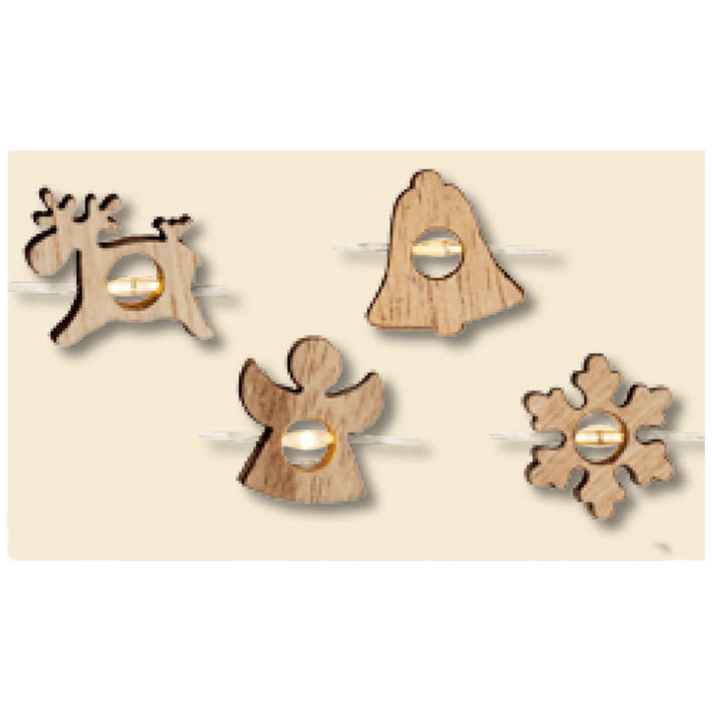 Dekorativna LED rasvjeta, za unutarnju uporabu, 20 mikro LED dioda, prozirni kabel dužine 0.9 met, hladno bijela boja svjetlosti, drveni ukras sob, zvono, anđeo, pahuljica, timer 6 h ON / 18 h OFF, napajanje 2 x AA baterije ( nisu uključene u pakiranje )