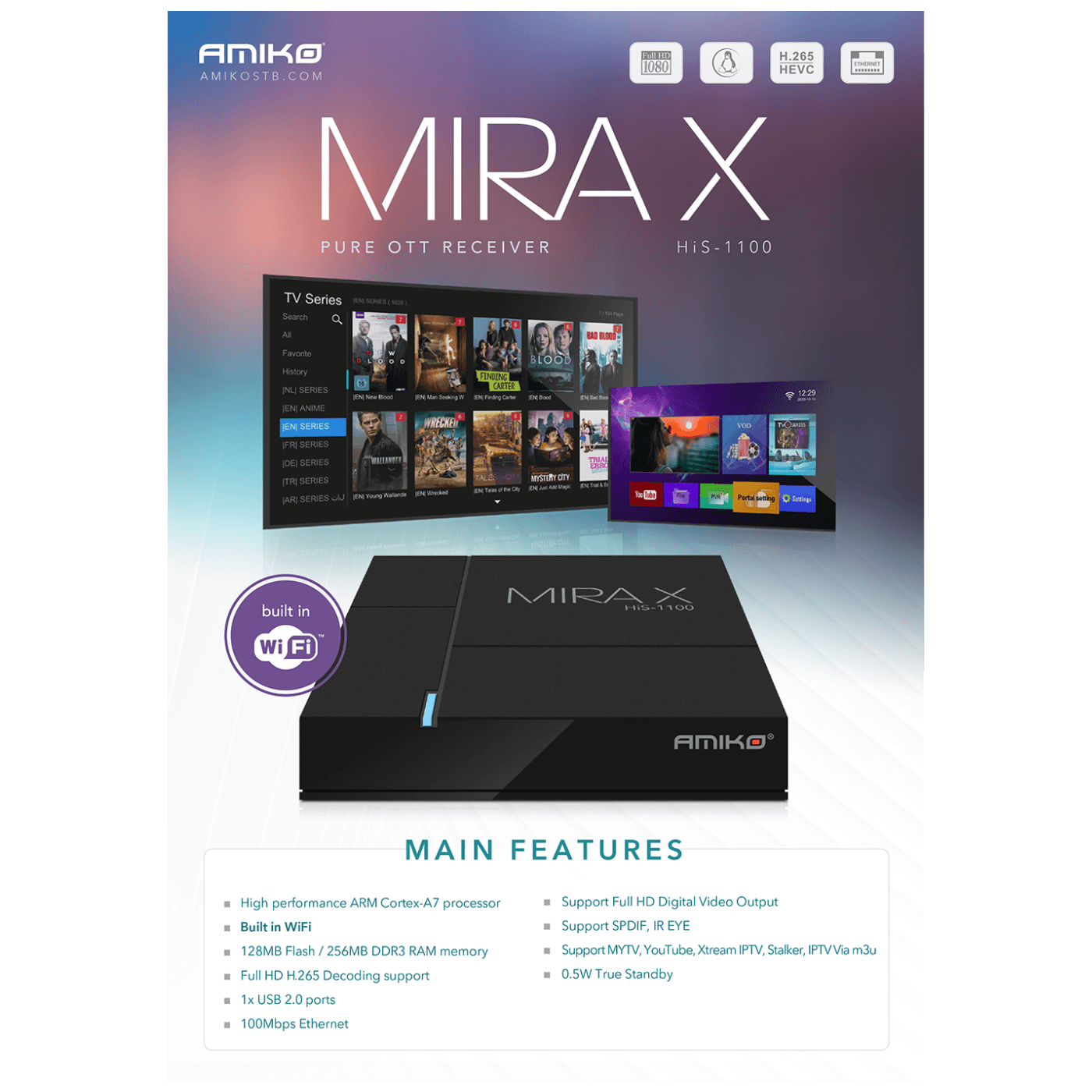Amiko Prijemnik IPTV@Linux, Full HD, H.265, LAN, WiFi - MIRAX 1100 Pure OTT