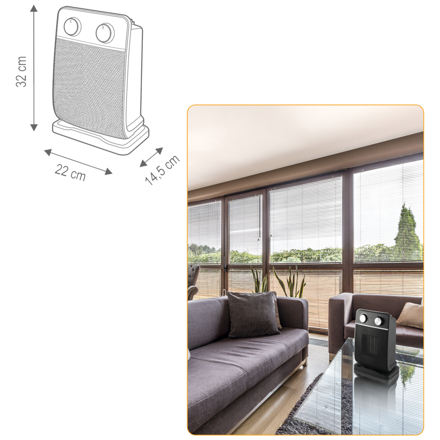 Grijalica sa ventilatorom, podesiva snaga 900W / 1800W, keramički grijači, ručno upravljanje, oscilacija 90°, automatsko isključivanje u slučaju prevrtanja , opcionalno biranje hladan / topao / vruč zrak, napajanje 230VAC / 50Hz