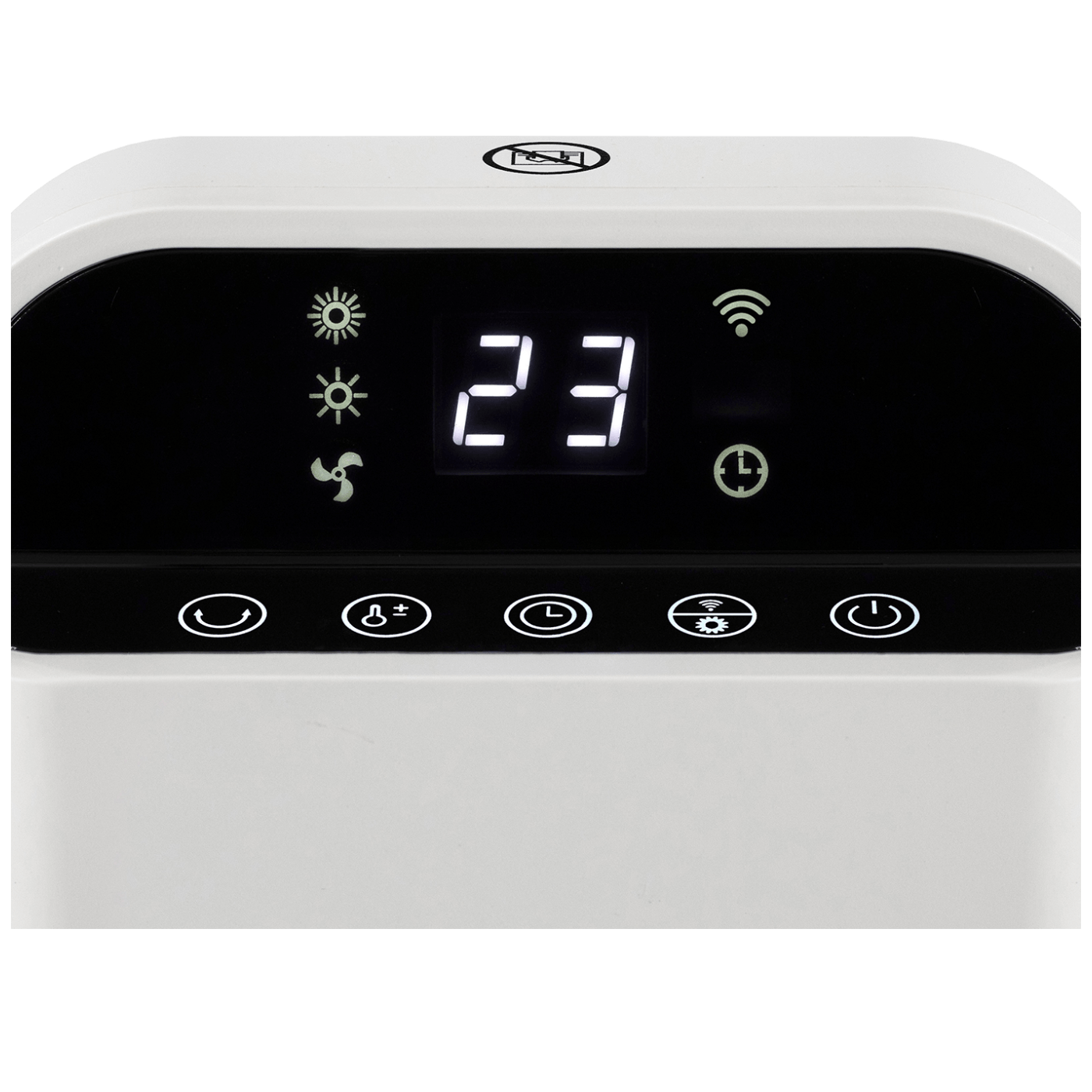 Pametna samostojeća grijalica sa daljinskim upravljačem, WiFi 2.4 GHz, podesiva snaga 1000 / 2000 W, kontrole preko dodirnih tipki, daljinskog upravljača ili bespaltne aplikacije za pametni telefon, podesiv termostat 15-45 °C, timer 12 h, zaštita od pregrijavanja, automatsko isključivanje u slučaju prevrtanja, oscilacija, razina buke 60 dB, napajanje 230 V ~ / 50 Hz, dužina napojnog kabela 1.4 met., dimenzije 230 x 560 x 150 mm, težina 2 kg