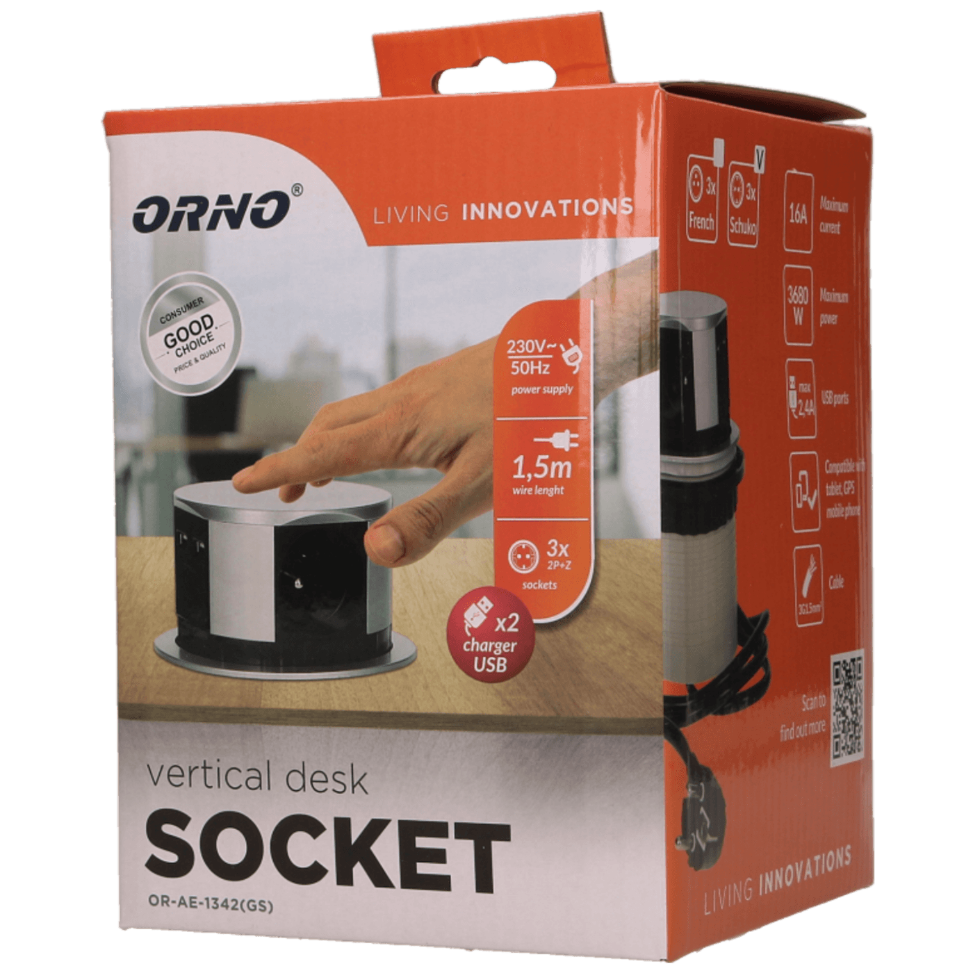 Orno Produžni kabel sa 3 x Schuko utičnice + 2 x USB, ugradbena - OR-AE-1342(GS)