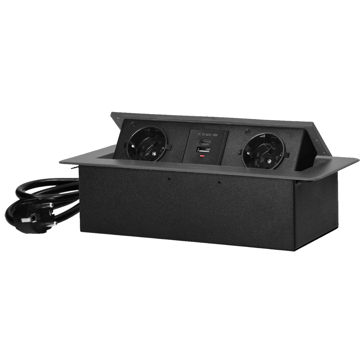 Produžni kabel sa dvije Schuko utičnice, sa uzemljenjem i zaštitom strujnog kruga, u kombinaciji s USB punjačima ugrađenim u kućište koje se može integrirati u stolove, radne površine, može se montirati i okomito i vodoravno, pružajući praktičan pristup električnim utičnicama.