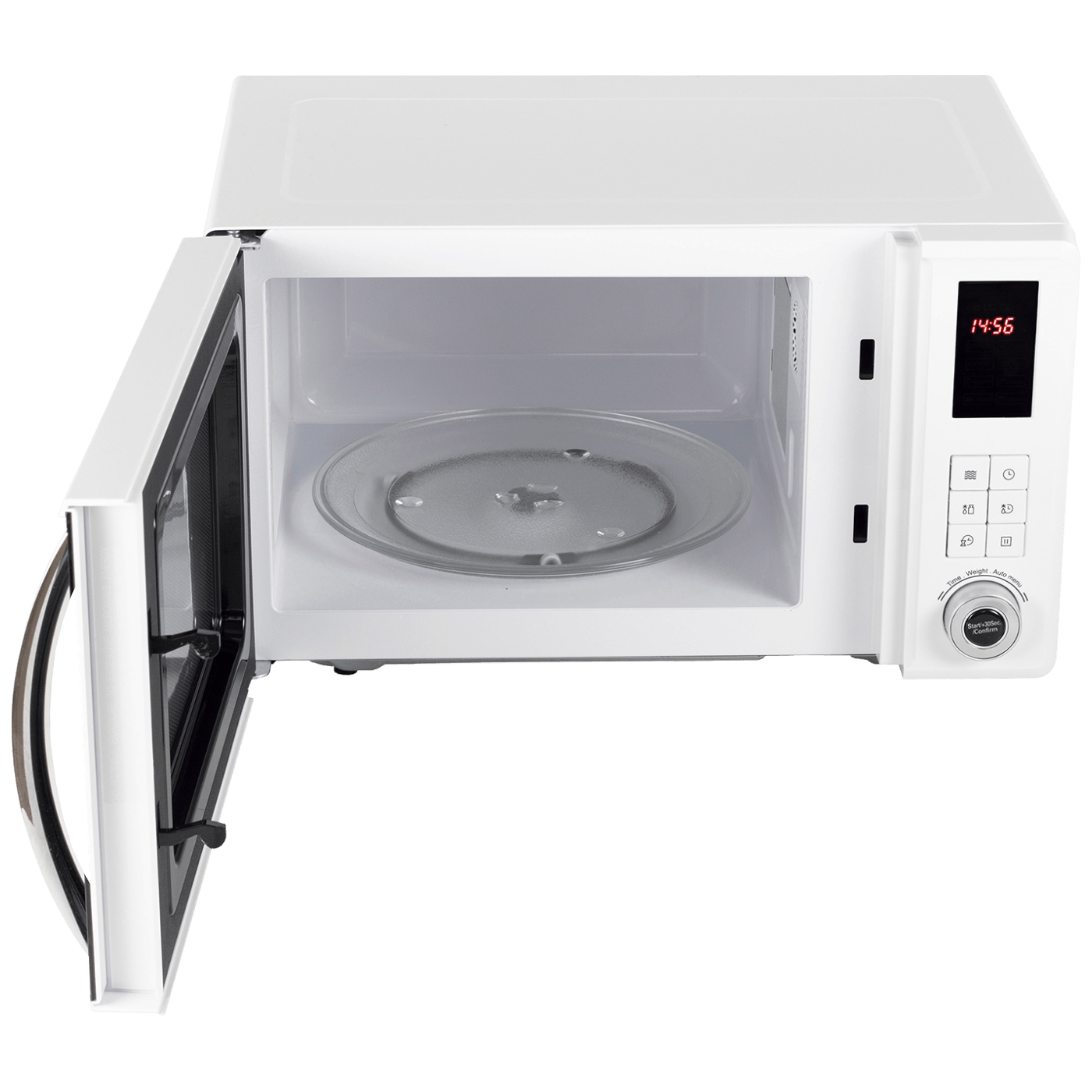 Mikrovalna pečnica, snaga 800 W, zapremina pećnice 23 litara, rotirajuči stakleni tanjur 27 cm, 5 nivoa mikrovalne snage, digitalna kontrola, LED zaslon, točno vrijeme, timer do 95 minuta max., unaprijed programirani programi, odmrzavanje po težini i vremenu, brava za djecu, otvaranje vrata na lijevu stranu, vrata staklena, dimenzije aparata 485 x 293 x 405 mm, boja bijela