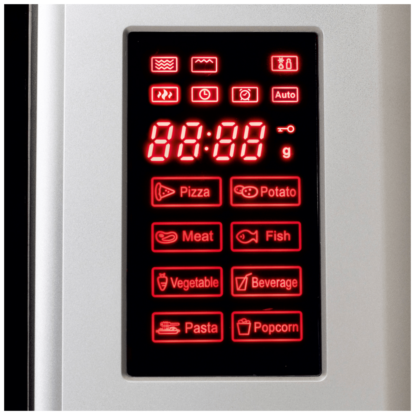 Mikrovalna pečnica sa grilom, snaga 800 W, gril 1000 W, zapremina pećnice 23 litra, rotirajuči stakleni tanjur 27 cm, 5 nivoa mikrovalne snage, digitalna kontrola, LED zaslon, točno vrijeme, timer do 95 minuta max., unaprijed programirani programi, odmrzavanje po težini i vremenu, brava za djecu, otvaranje vrata na lijevu stranu, vrata staklena, dimenzije aparata 485 x 293 x 405 mm