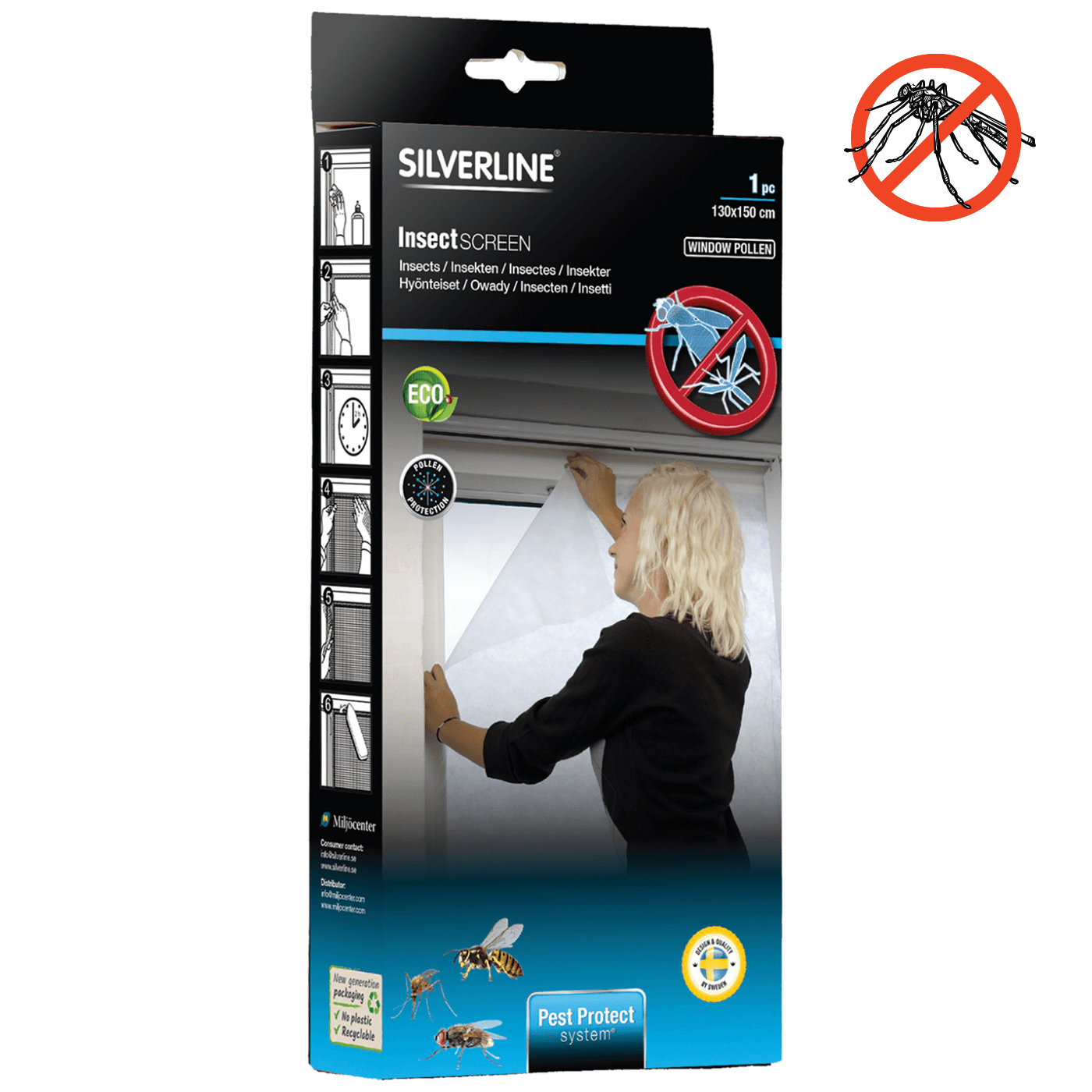 Mreža protiv komaraca Silverline IN 22452 može se postaviti na prozor i ima učinak filtra za pelud i prašinu pomoću tanke bijele mikromembranske tkanine. Olakšava ventilaciju za osobe koje pate od alergija, pa manje polena ulazi u stan. Ugradnja mreže protiv komaraca ne zahtijeva bušenje, samo je jednostavno zalijepite na okvir, dimenzije 1300 x 1500 mm