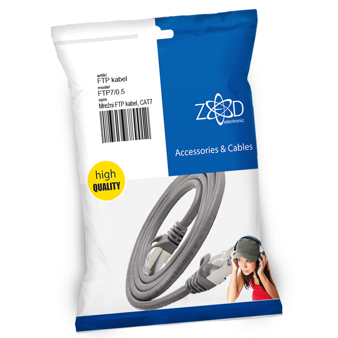 Mrežni FTP kabel, dužina 0.5 met, CAT7, AWG26, bakarni vodić, bez halogena, upletena parica, parice pojedinačno oklopljene, blister pakiranje sa EAN code-om, 1 kom, siva boja.