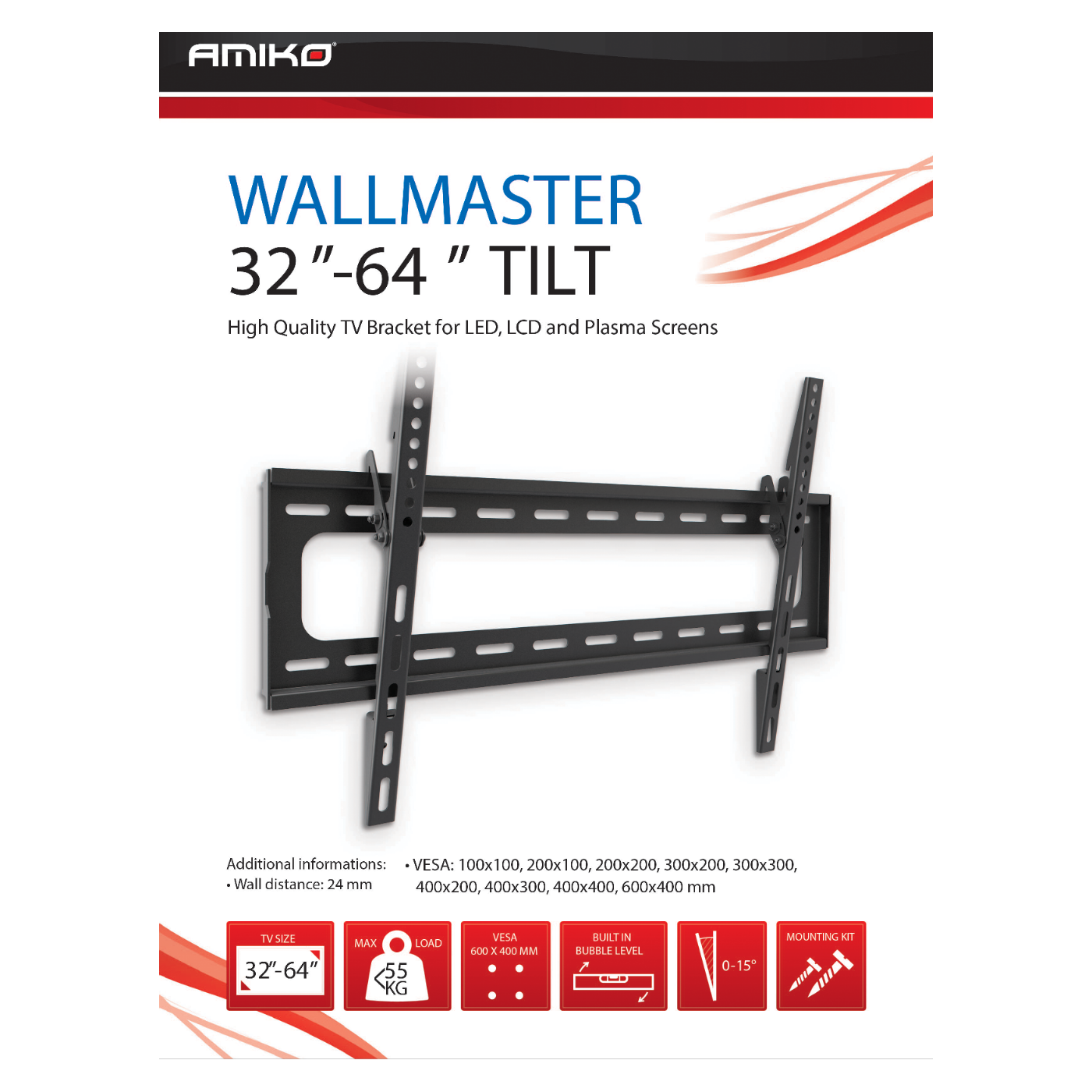 Amiko Nosač zidni za TV prijemnik 32" - 64", 55 kg, 2D - Wallmaster 32-64 Tilt