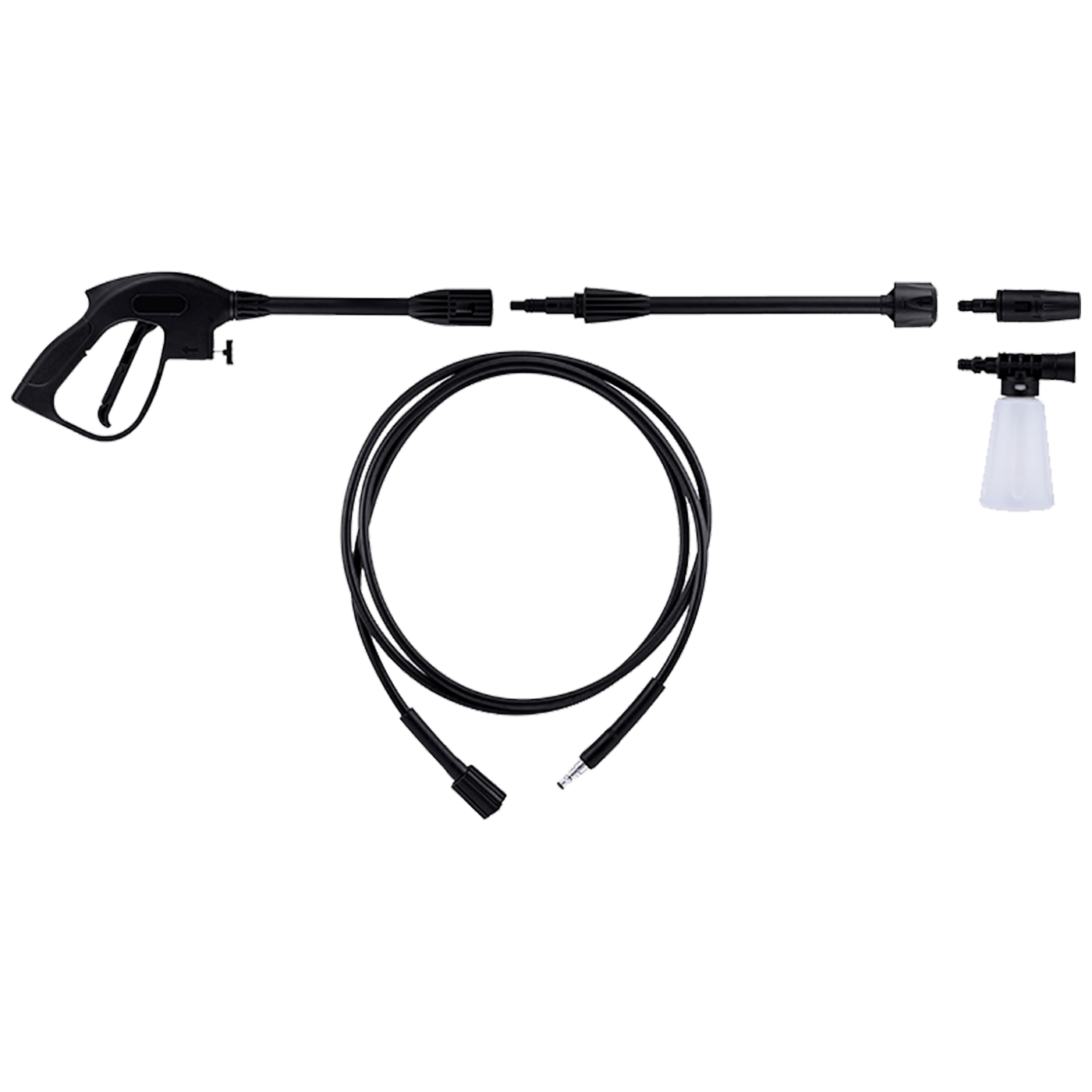 Komplet, osim samog uređaja, uključuje visokotlačno crijevo, cijev, pištolj, rotirajuću (TURBO) mlaznicu, ulazni filtar i spremnik za deterdžent.