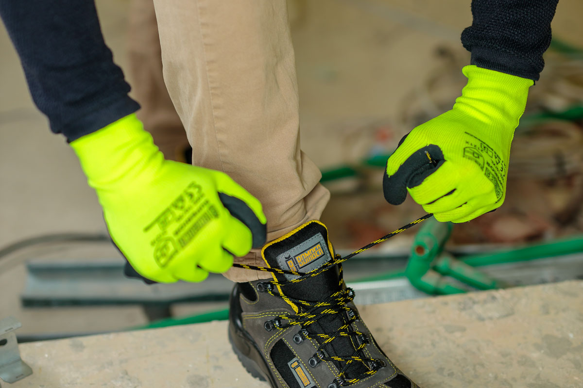 Pletene rukavice od žutog poliestera, presvučene na dlanu i prstima slojem penastog lateksa crne boje. Ove rukavice imaju izuzetno pouzdan hvat.