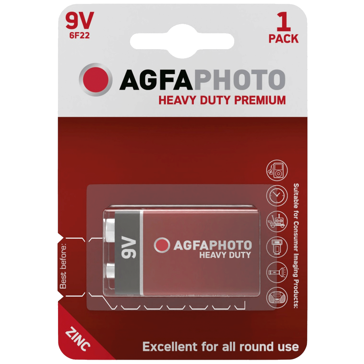 - AgfaPhoto Heavy Duty Half-life 9V Battery B1" je izdržljiva i pouzdana 9V baterija koja je izvrsna za upravljanje raznim elektroničkim uređajima kao što su daljinski upravljači, detektori dima ili igračke.