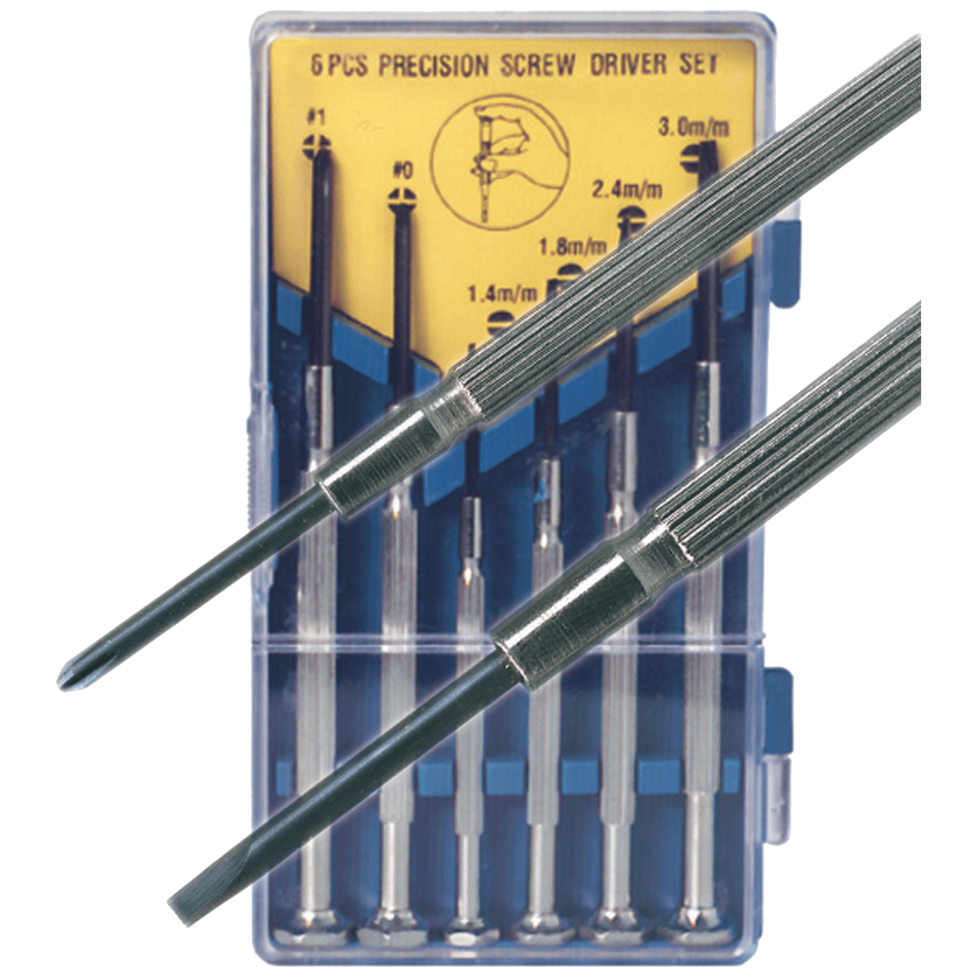 Set 6 komada preciznih odvijača, metalne konstrukcije sa rotirajućom zaštitnom kapicom, ravni 1.4 / 2 / 2.4 / 3mm , PH0 / PH1