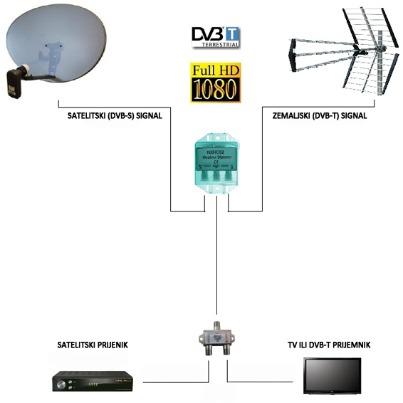 Udružuje signal od satelitske i obične antene (ili kablovske) u jedan kabel, signal se dijeli kroz TV/SAT/FM uticnicu - vanjska montaža, Frekventni opseg; VHF-UHF: 47-858MHz, satelitski: 950-2150MHz, gubitak <3dB.