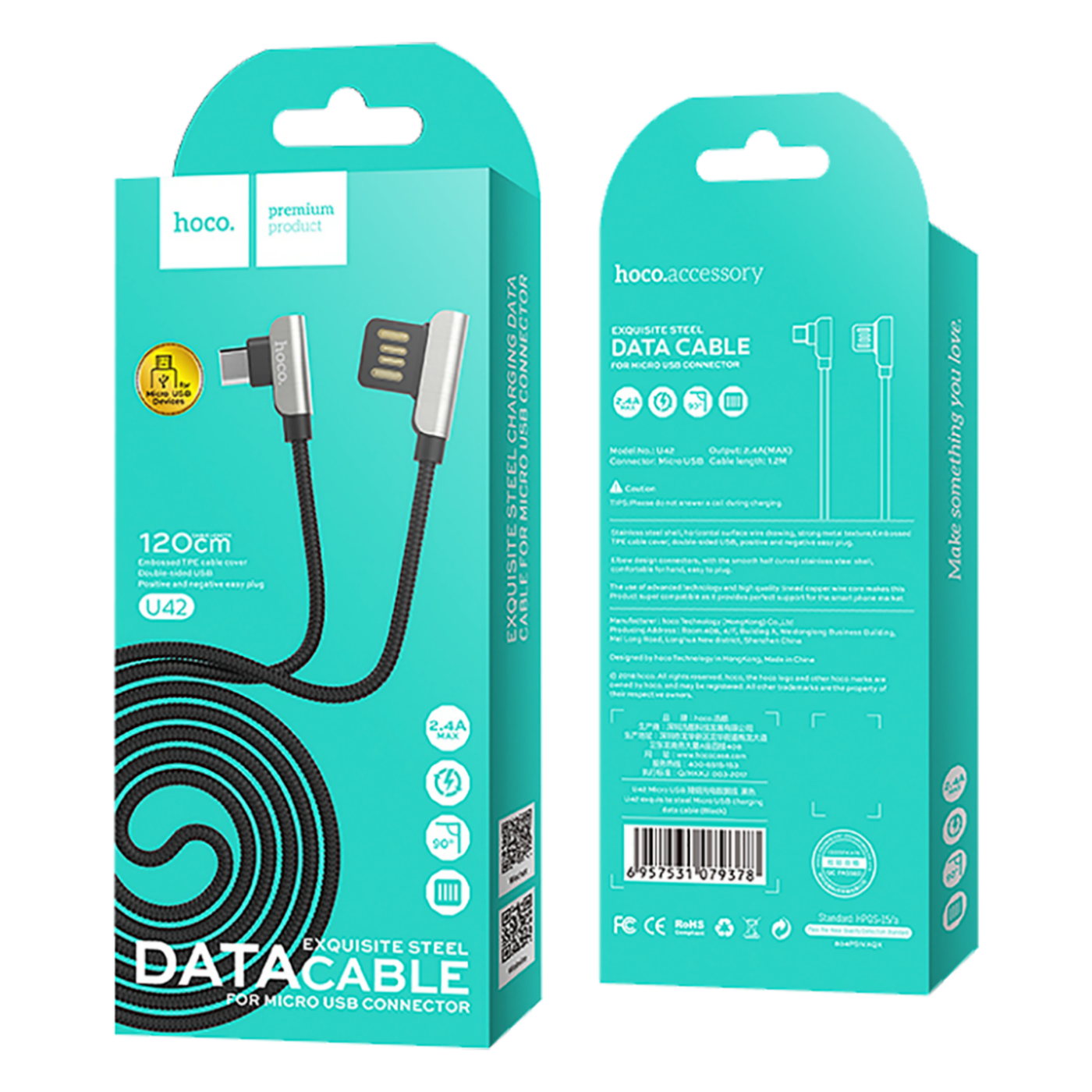 hoco. USB kabl za smartphone, micro USB, 1.2 met., 2.4 A, crna - U42 Exquisite steel, Micro USB, BK