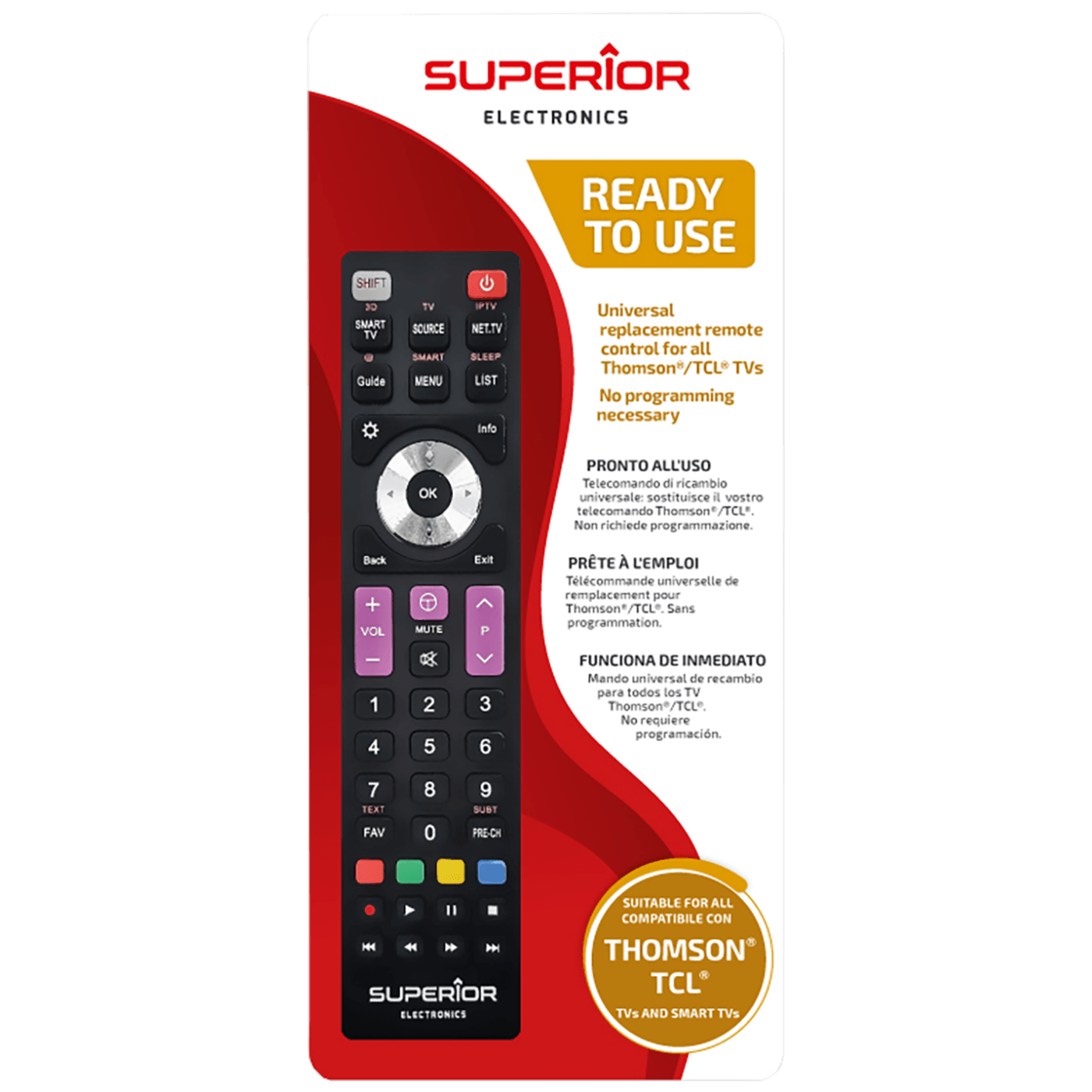 Svestran i jednostavan za korištenje daljinski upravljač savršen za Thomson i TCL TV prijemnike. Uz unaprijed postavljene kodove, brzo ga povežite s vašim televizorom i uživajte u jednostavnom upravljanju.