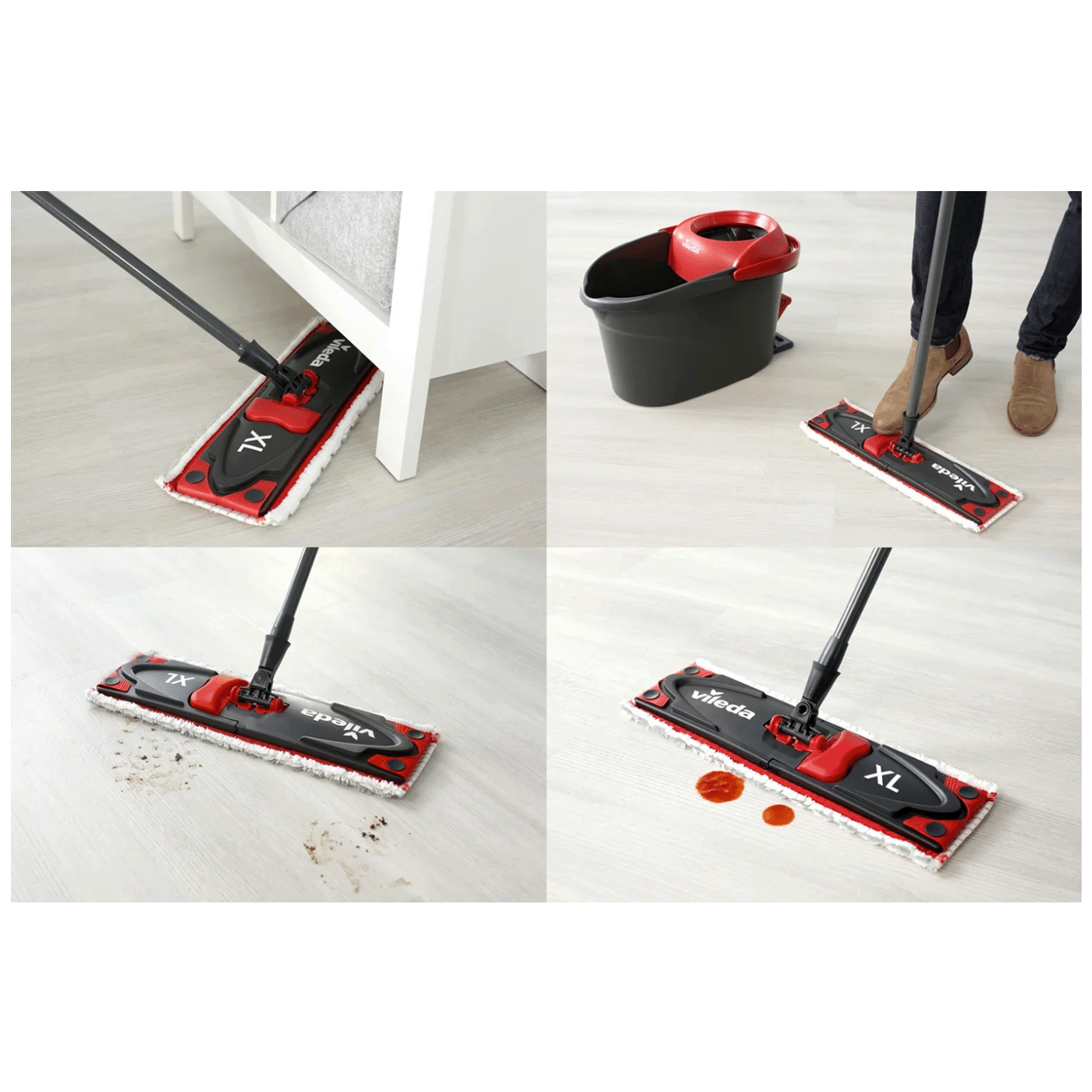 Vileda Ultramax Turbo XL je moderni sistem za čišćenje podova koji uključuje plosnati mop i rotirajuću kantu za cijeđenje, omogućavajući brzo i temeljito čišćenje svih vrsta podova – bez potrebe za hemikalijama. Uklanja čak 99% bakterija koristeći samo vodu, što je dokazano testovima nezavisnog, akreditovanog instituta.