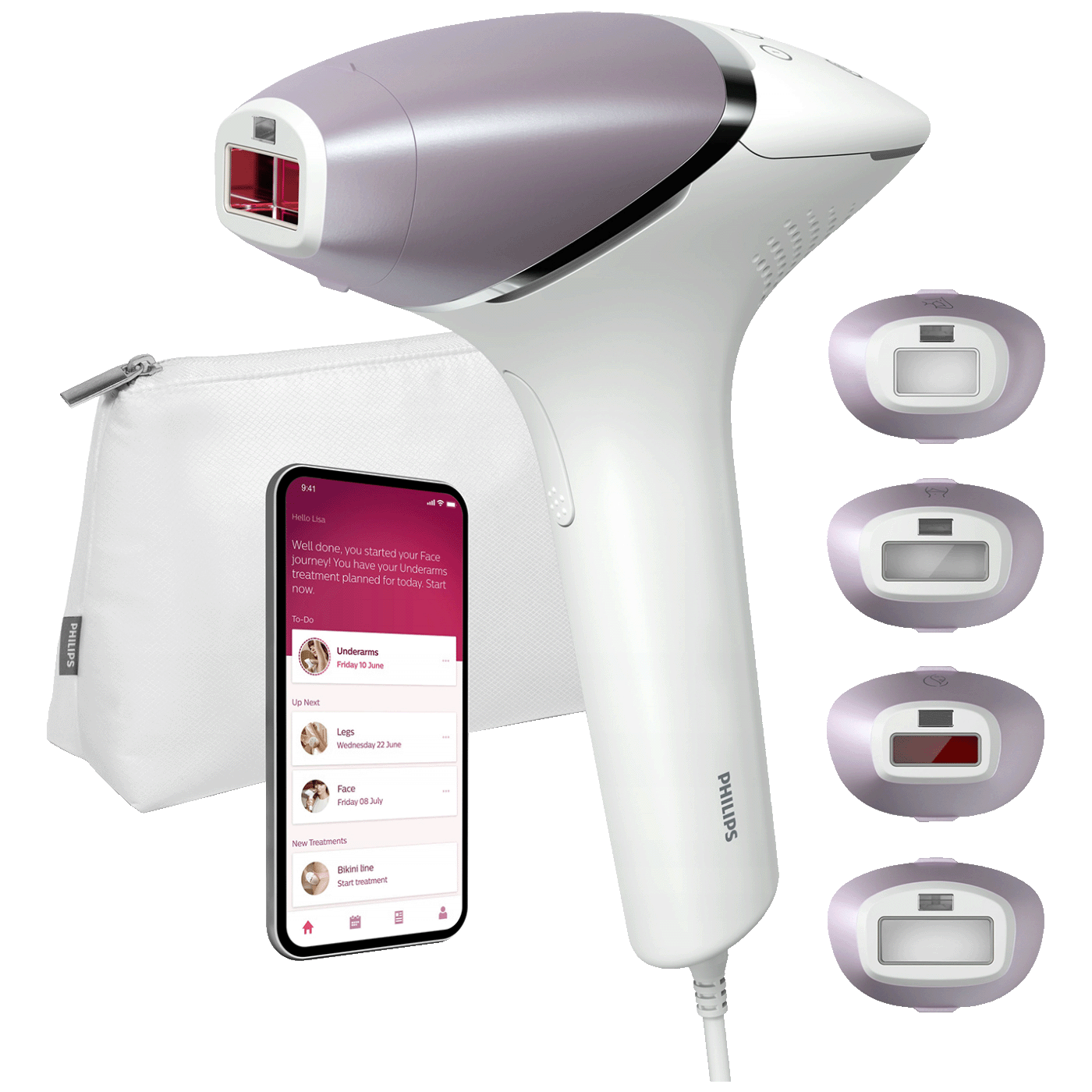 Posebno dizajnirani dodaci savršeno pristaju oblinama vašeg tijela i pokreću najučinkovitije programe za svako područje tijela kada su povezani. Lice: ravan dizajn i mali prozor s UV filterom. Tijelo: zakrivljeno prema unutra s velikim prozorom. Bikini i pazuh: Zakrivljeni prema van za teško dostupna područja.