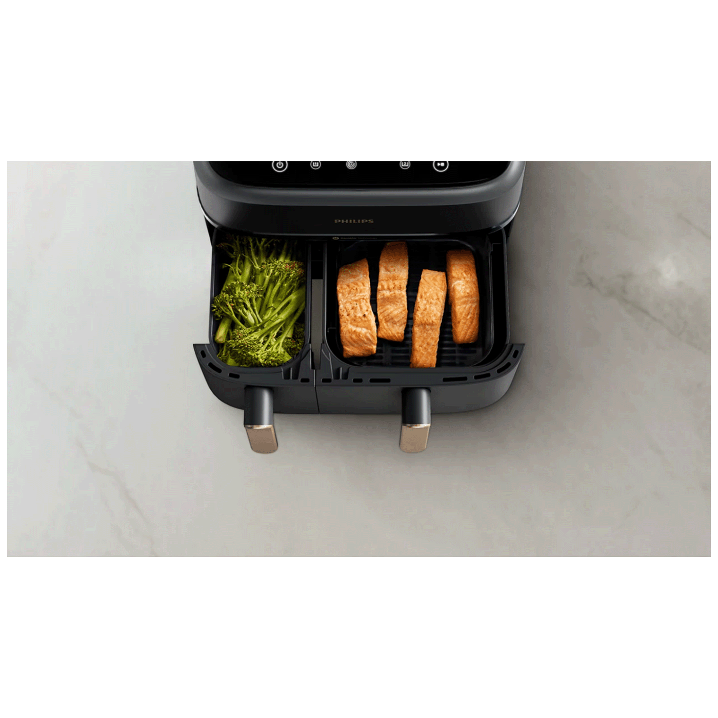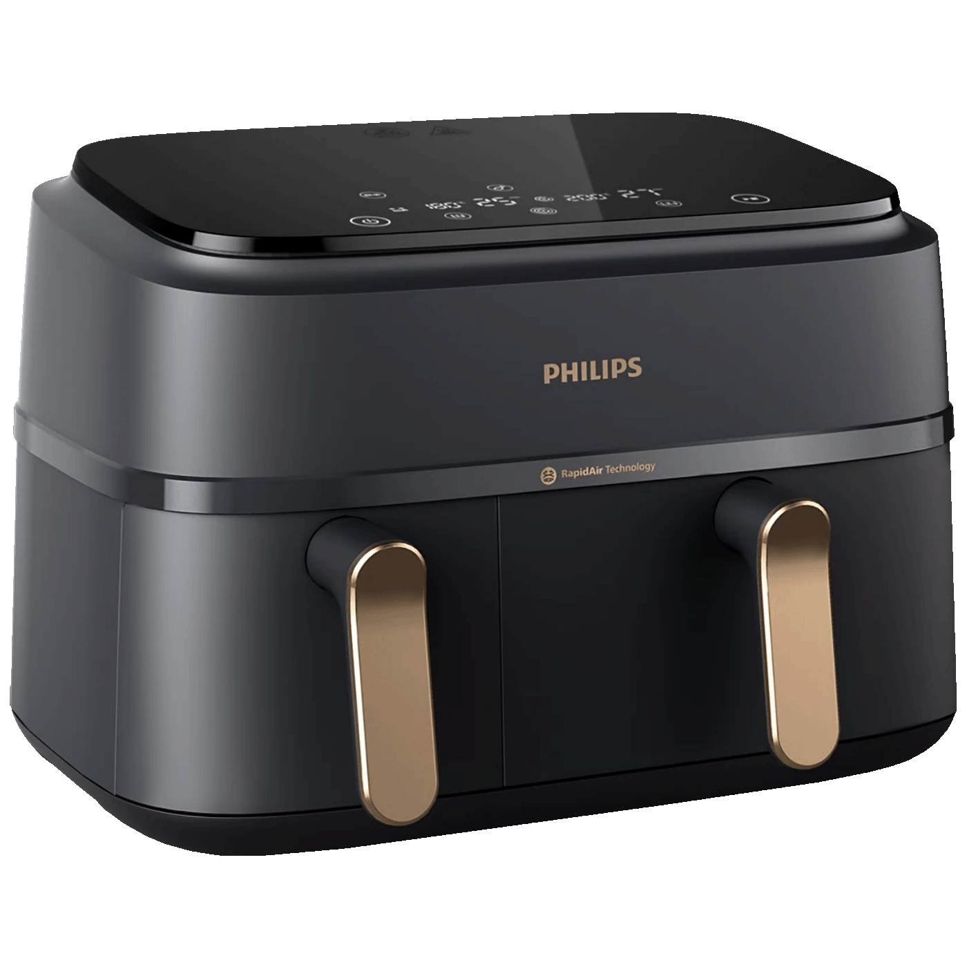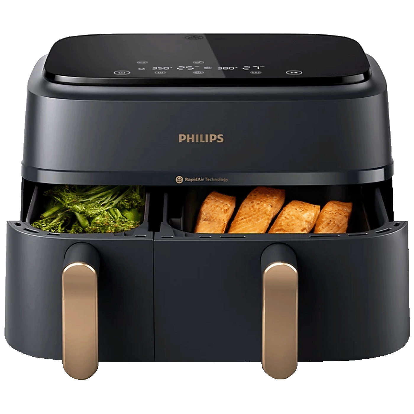 Tehnologija Rapid Air osigurava ravnomjernu cirkulaciju toplog zraka i hrskave rezultate uz znatno manje ulja. Funkcija Time sinkronizira vrijeme kuhanja u obje košare, a Copy brzo postavlja iste postavke temperature i trajanja na obje košare jednim dodirom.