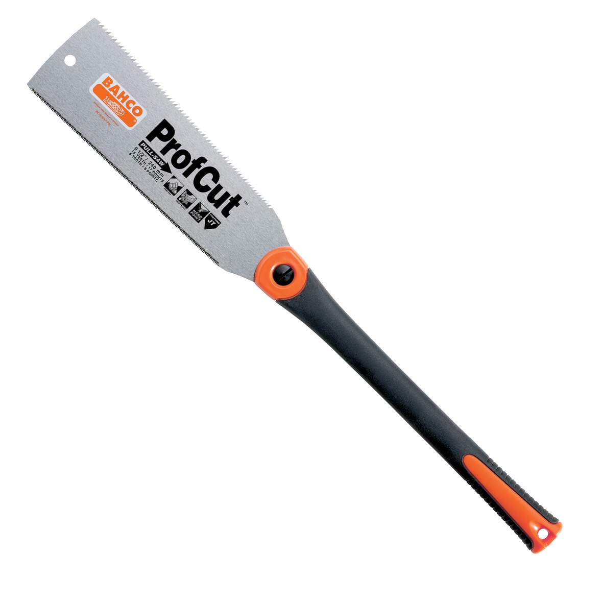 Pila Bahco japanskog stila idealna je za precizno rezanje različitih materijala, uključujući profilno puno drvo, sendvič materijale i ivericu. Ova ručna potezna pila dolazi s dva lista pile, jednim sa 9 zuba po inču za brže rezanje poprečnih finih rezova te drugim sa 17 zuba po inču za precizno rezanje uzdužnih srednjih rezova. Fleksibilnost lista pile omogućava bolje prijanjanje uz materijal, a gumirani rukohvat pruža udobnost i bolje hvatanje. Ova pila omogućava izmjenu lista pile kako bi odgovarala različitim potrebama rezanja, a njezina ukupna dužina lista iznosi 240 mm, što utiče na maksimalnu dubinu reza.