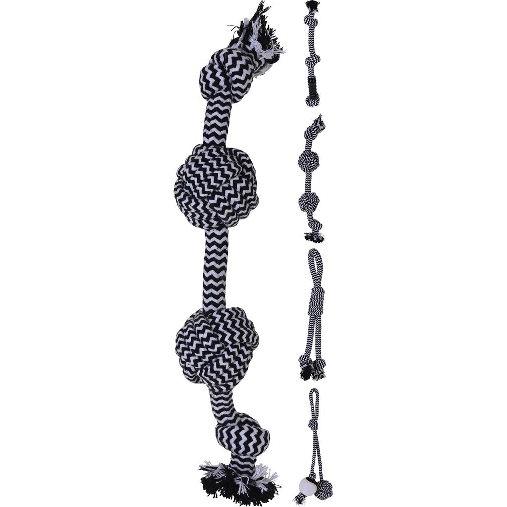 Igračka za pse crno bijelo uže je namijenjena za žvakanje, vučenje i igranje pasa svih veličina i uzrasta. Izrađena je od izdržljivog materijala koji je siguran za pseće zube i desni. Uže je srednje debljine i pruža odličan otpor pri žvakanju, što pomaže u održavanju zdravlja zuba pasa.