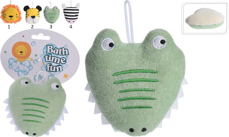 Spužva za kupanje 529002110 je mrežasta pletena spužva s poliesterskim punjenjem, izrađena posebno za djecu. Dolazi u četiri različita dizajna, koji su inspirirani različitim životinjama: zebra, lav, krokodil i tigar.