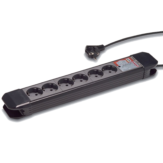 Produžni kabel sa zaštitom, 5 utičnica, dužina 1.5m, sa prekidačem, 3 x 1.5 mm², 16A/3680W, 110-250V, IK07, 6000V, 4500A, 120J, radna temperatura -25ºC + 85ºC, standard UNE 20 315-2-7 / EN 60669, crna boja.