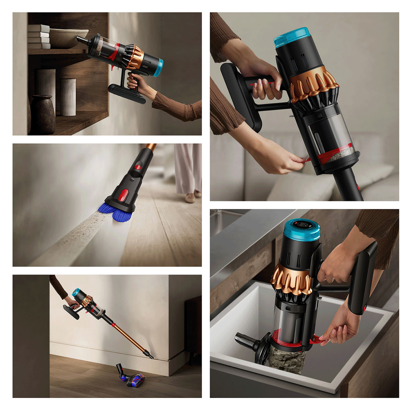Dyson je uveo i CleanCompaktor™ spremnik, koji sabija prašinu i otpad, omogućavajući veću zapreminu (do 30 dana prikupljanja) te higijensko pražnjenje bez ostavljanja prašine ili dlačica na unutarnjim površinama. U režimu Submarine™ 2.0 moguće je obaviti i mokro čišćenje — hidratacijom, trenjem i ekstrakcijom ukloniti mrlje s tvrdih podova, uz 300 ml spremnik za vodu. Spajanje s aplikacijom MyDyson omogućava praćenje stanja baterije, upozorenja za održavanje i preuzimanje dodatnih modova čišćenja.