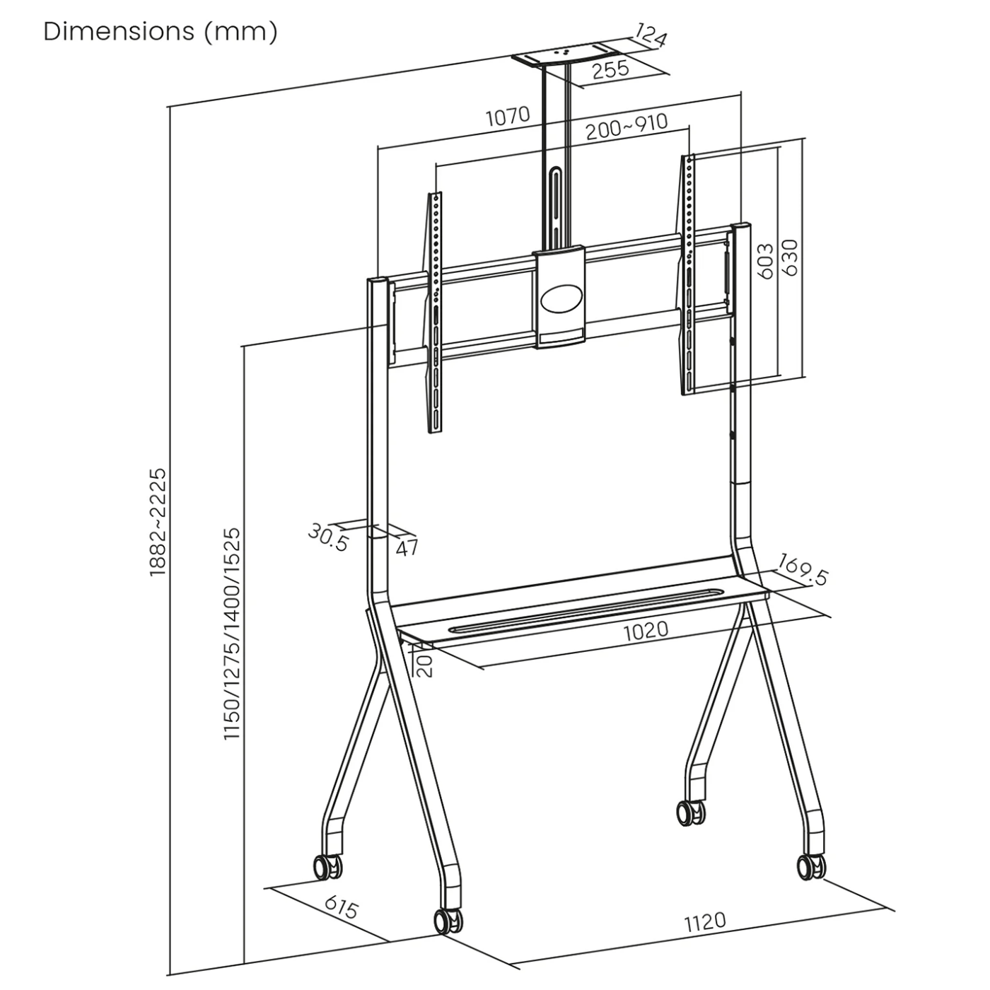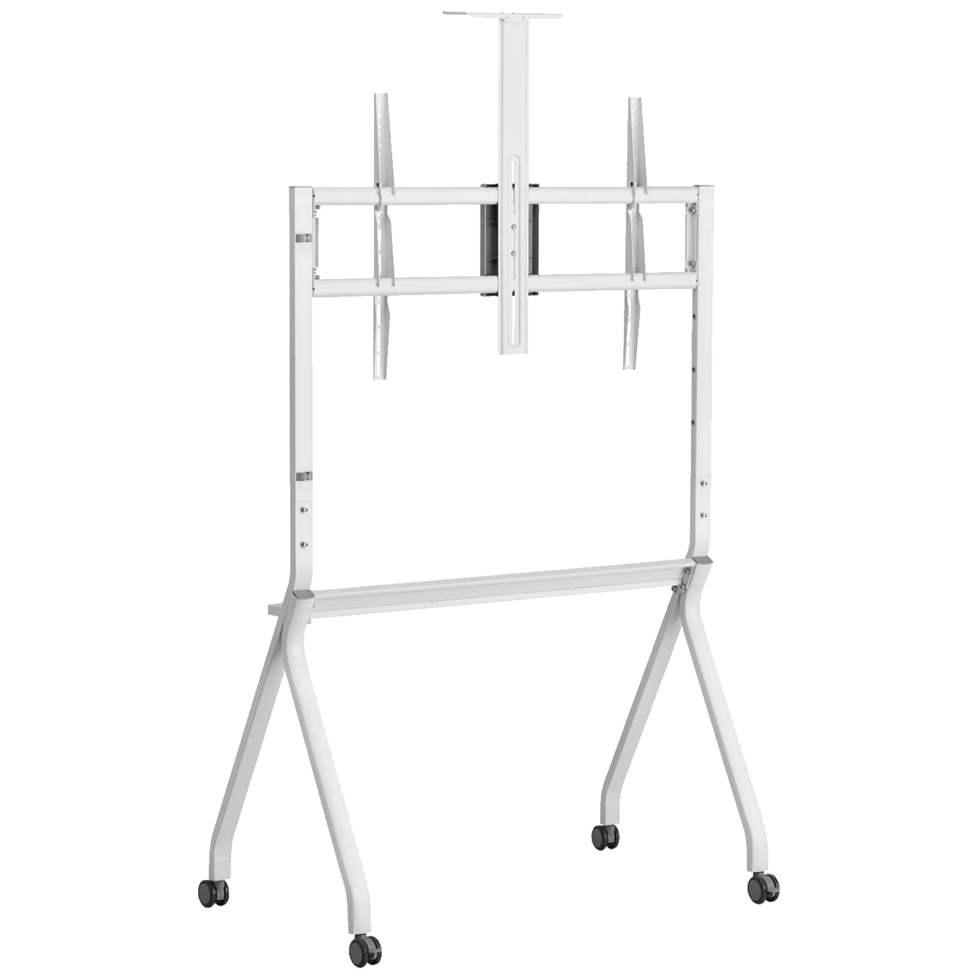 TV se može montirati na jedan od četiri visinska položaja (1150 / 1275 / 1400 / 1525 mm), prilagođavajući ga visini gledanja i uvjetima prostora. Uređaj ima maksimalno opterećenje do 120 kg na nosač, dok dodatna polica može nositi do 10 kg, idealno za postavljanje kamere, dekodera, playera ili drugih periferija. Stalak podržava VESA montažu do 900 × 600 mm, što osigurava kompatibilnost sa širokim spektrom velikih televizora.
