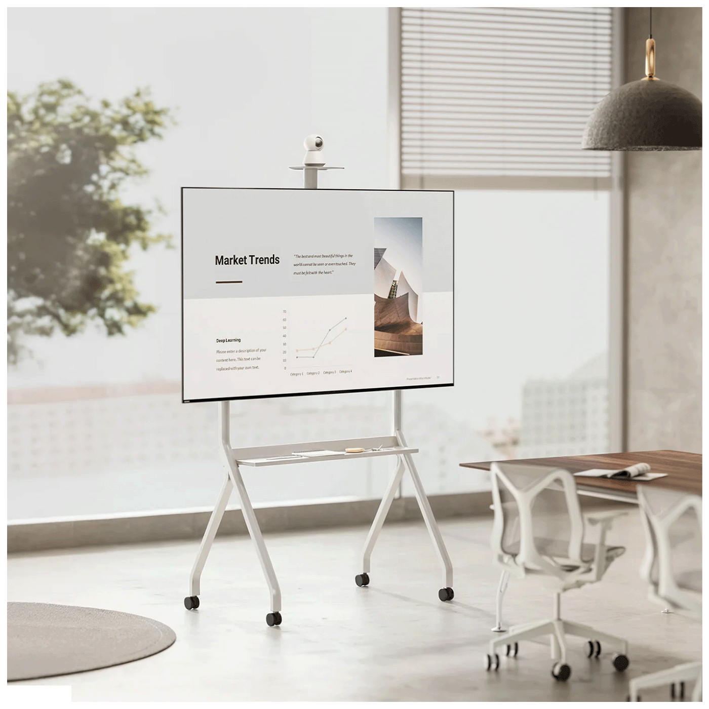 Stalak je izrađen od čvrstog, praškasto bakrom obojenog čelika, osiguravajući stabilnost čak i kod većih televizora. Konstrukcija s četiri kotača omogućava lako pomicanje cijelog sistema, dok mehanizam za zaključavanje kotača osigurava stabilnost kad je u upotrebi.