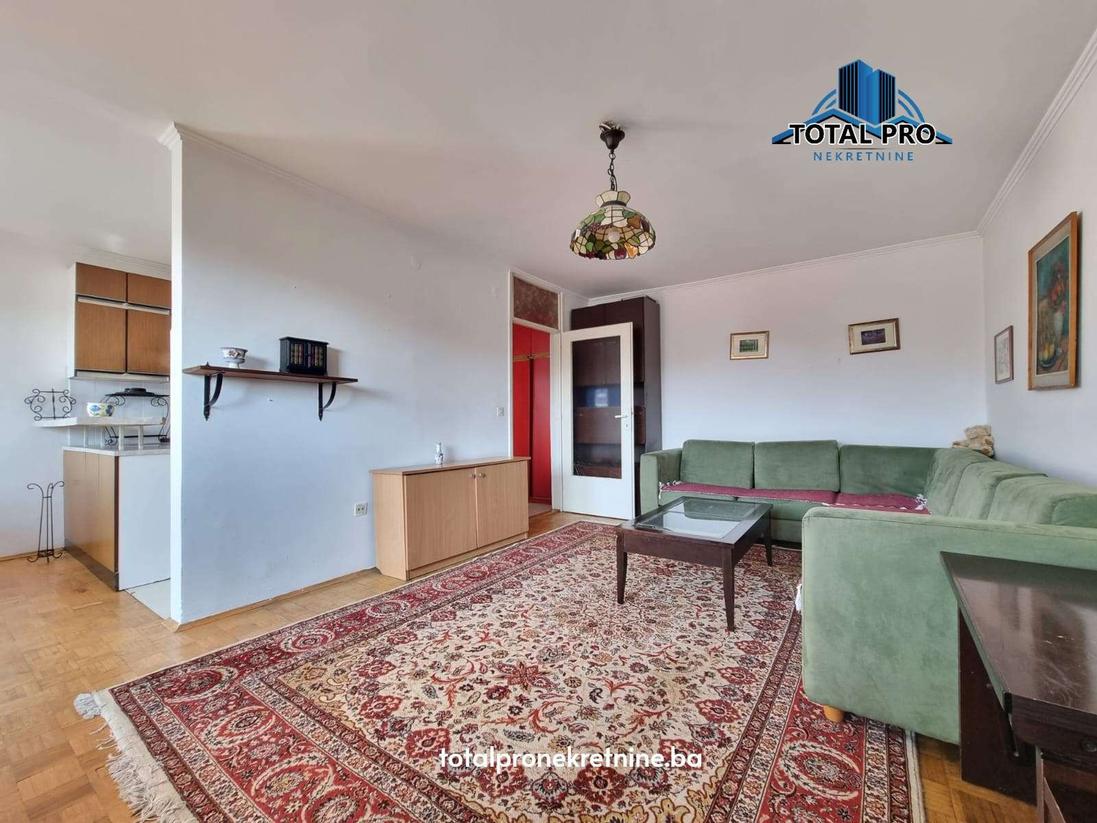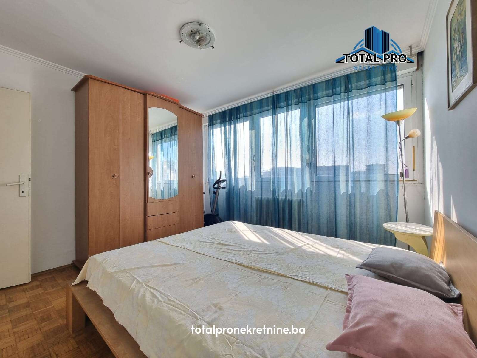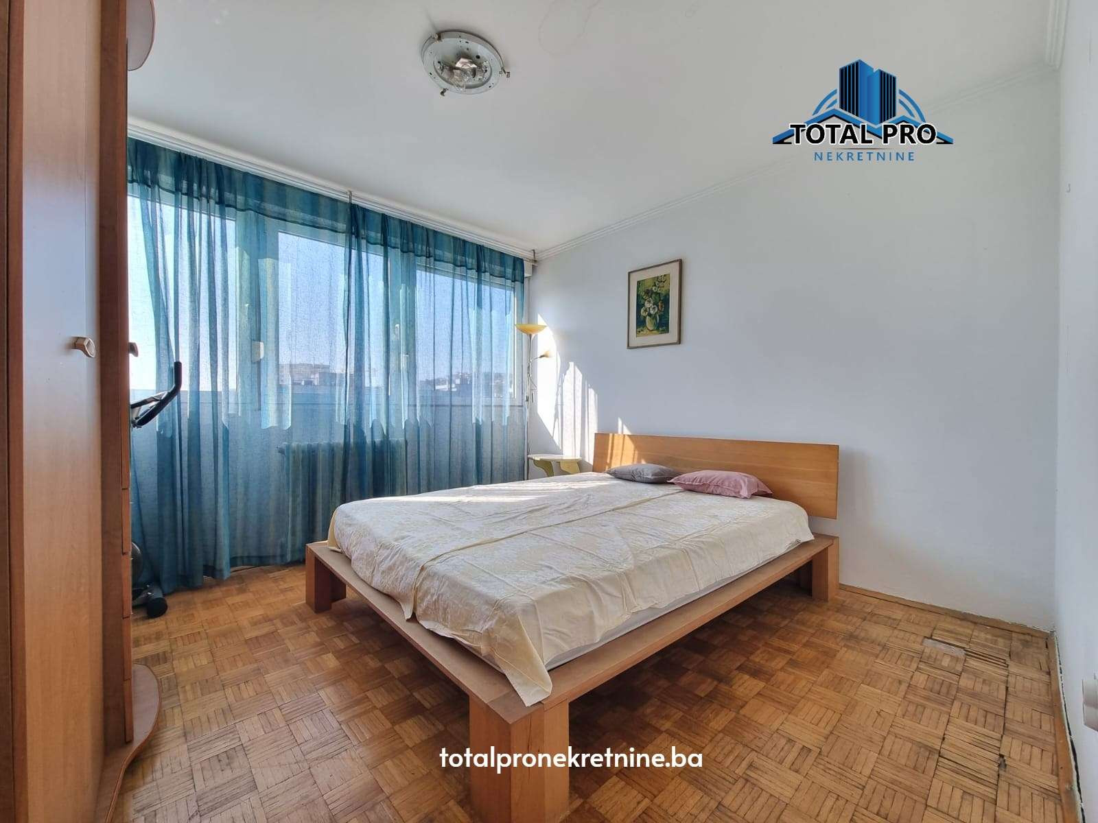- Podne obloge: Parket (dnevni boravak, trpezarija, spavaća soba); Keramika (kupatilo, kuhinja, predsoblje, balkon)