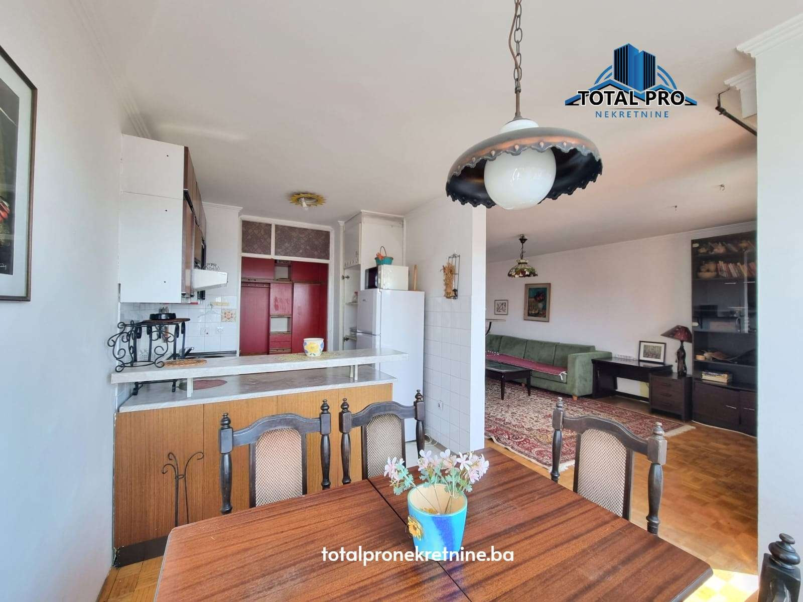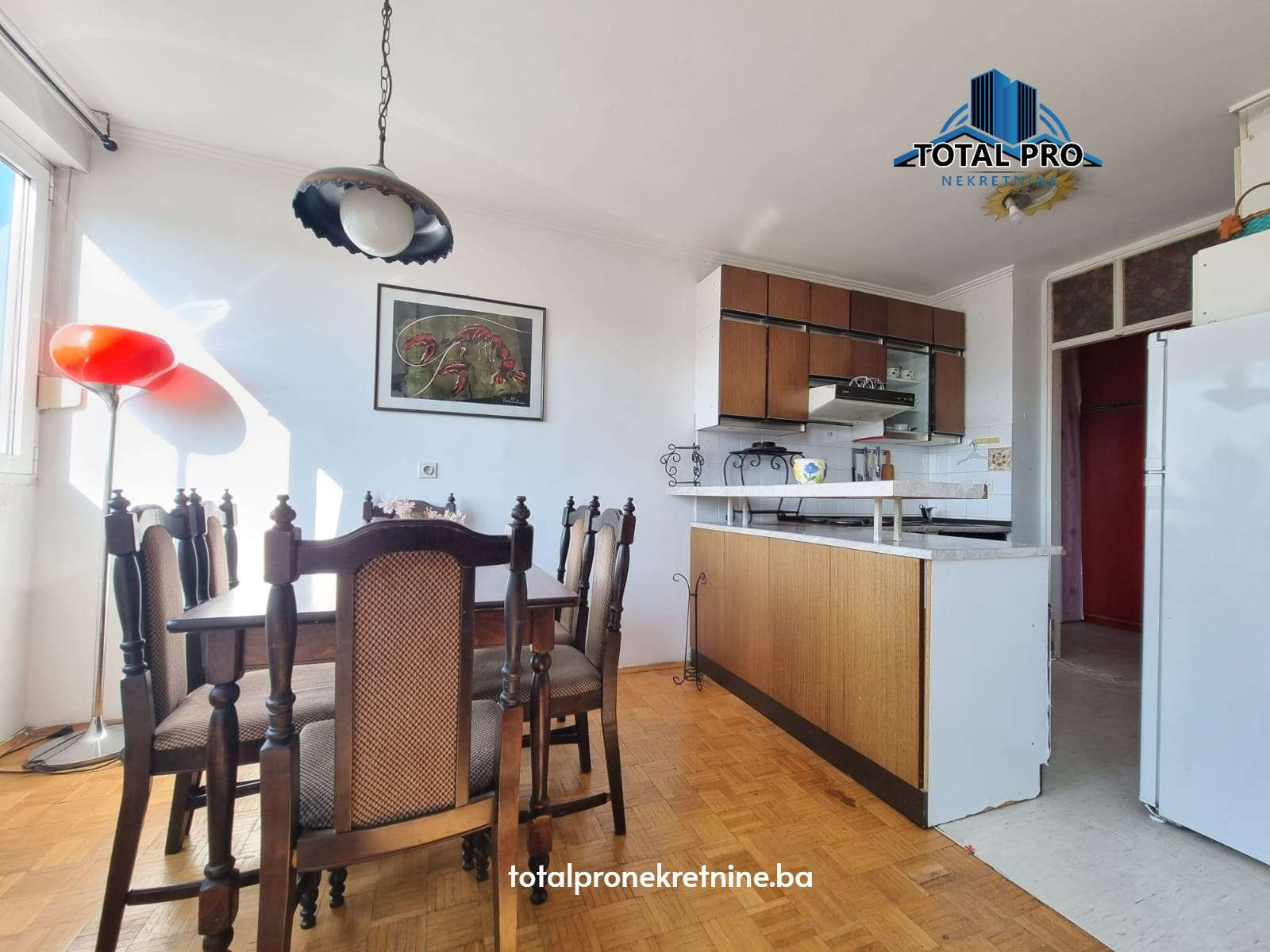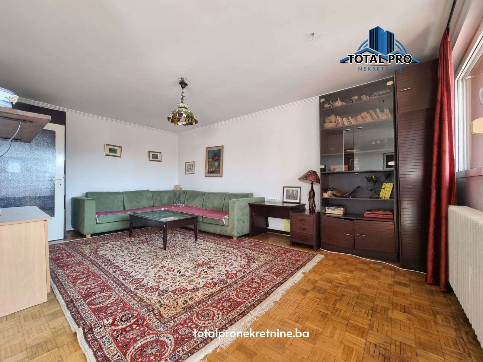 - Podne obloge: Parket (dnevni boravak, trpezarija, spavaća soba); Keramika (kupatilo, kuhinja, predsoblje, balkon)