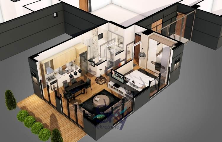 Zgrada se sastoji od prizemlja i četiri sprata, nudeći ukupno 28 stanova, uz mogućnost izbora između dvosobnih i trosobnih stanova, čije površine variraju od 45m² do 65m². Svaki stan je građen koristeći najkvalitetnije materijale, obezbjeđujući vrhunsku izolaciju i centralno grijanje pomoću toplotnih pumpi za maksimalnu efikasnost i komfor. Balkoni dodaju dodatnu vrijednost, omogućavajući uživanje na otvorenom s predivnim pogledom.