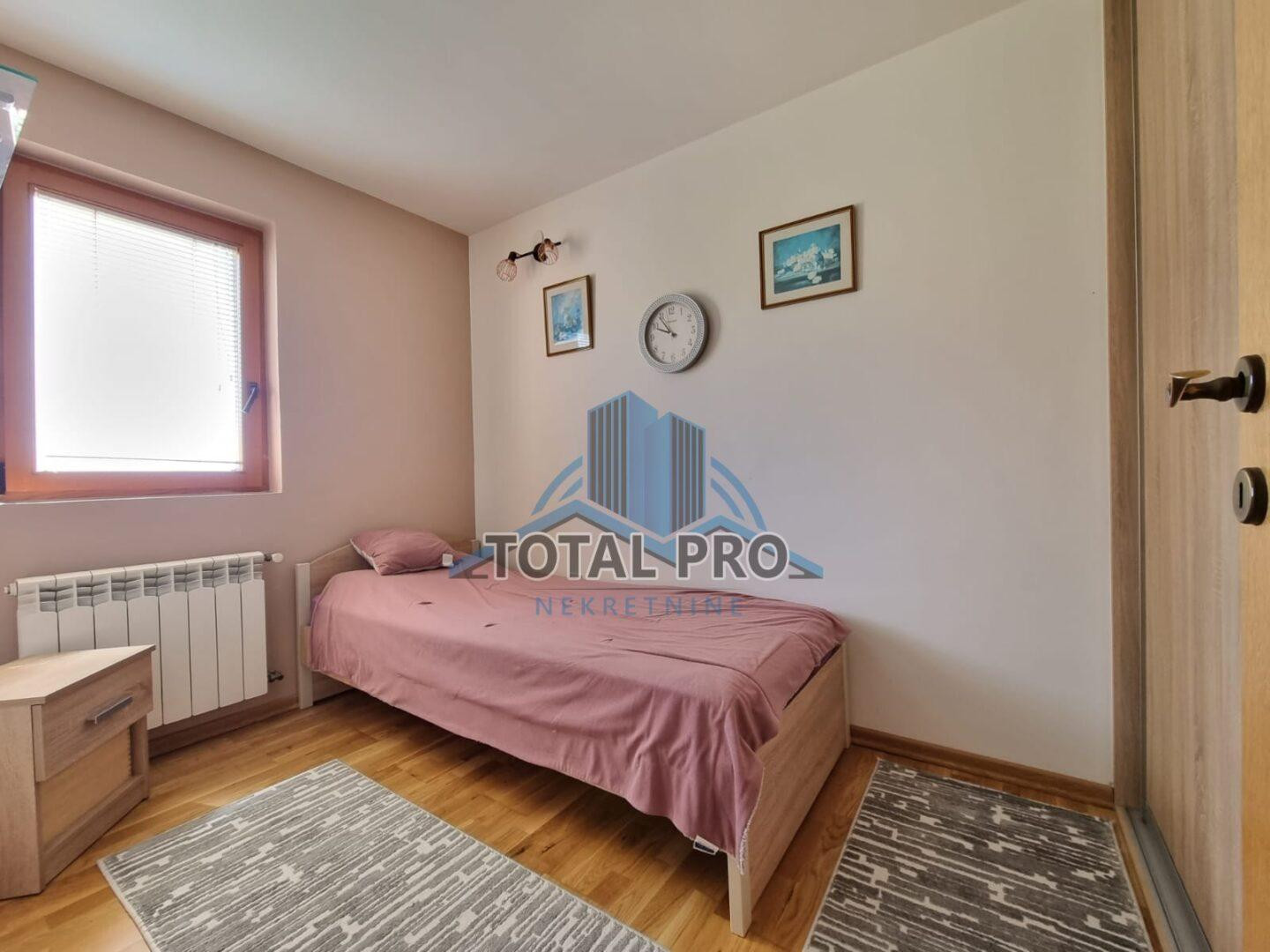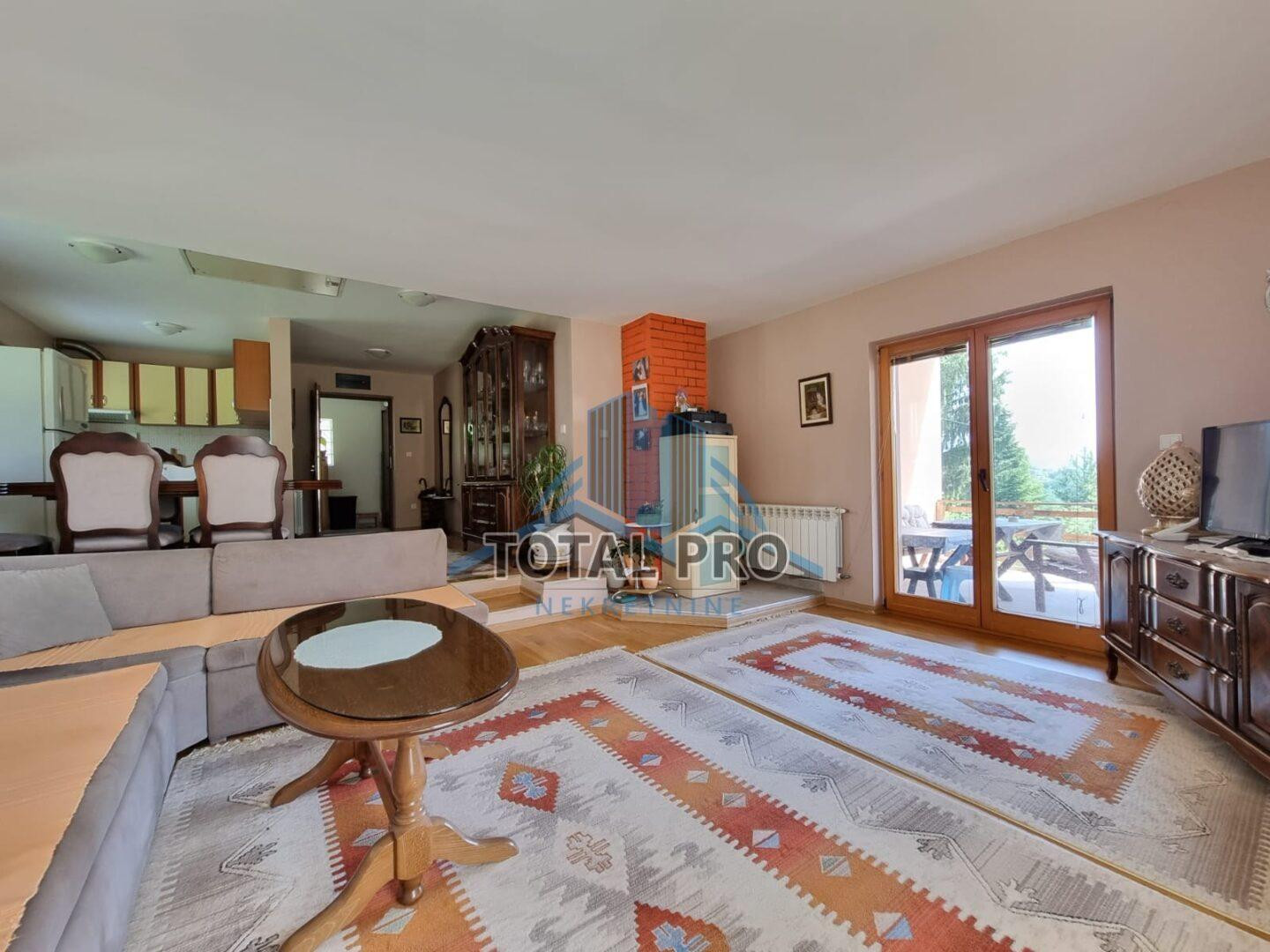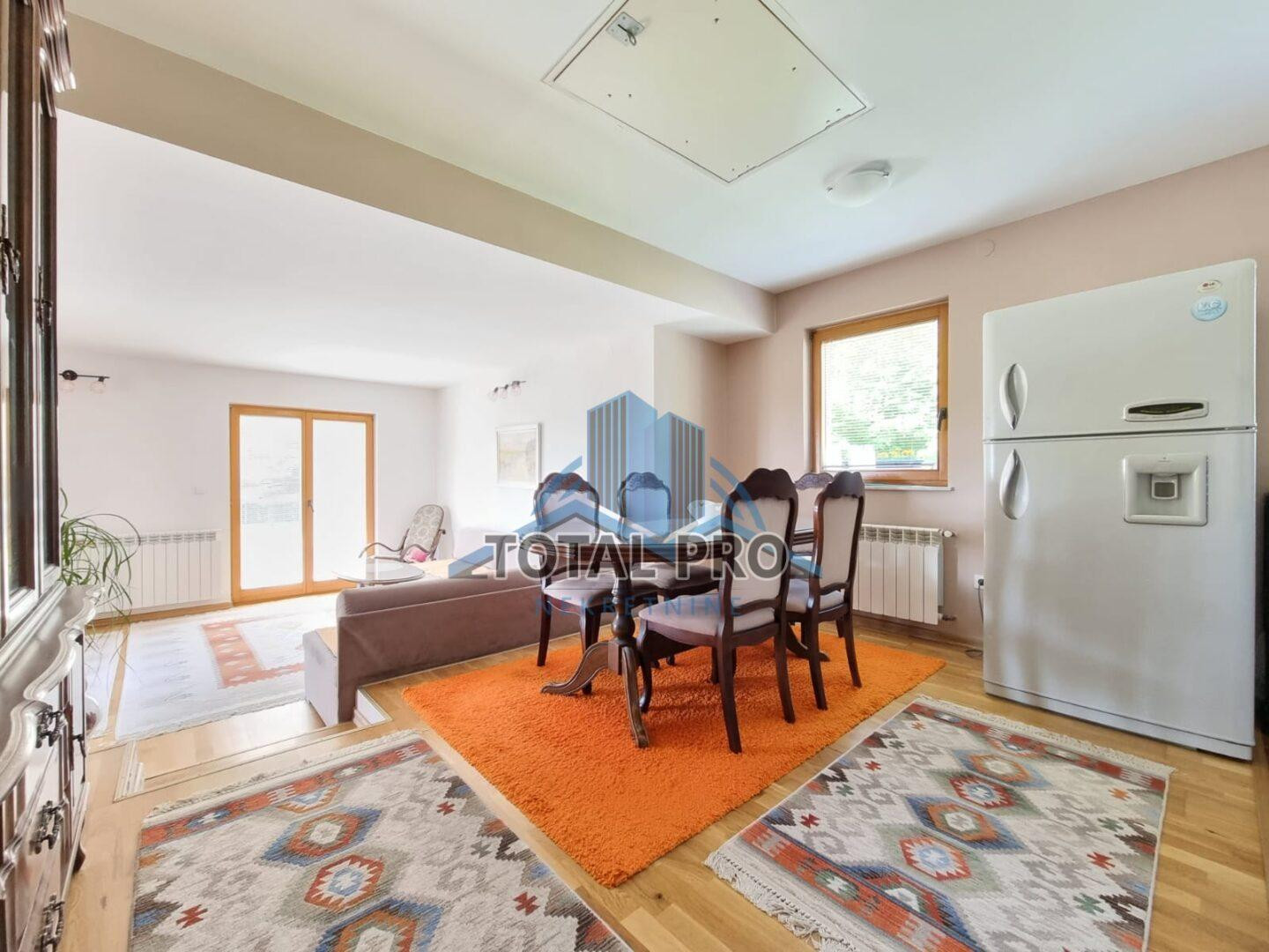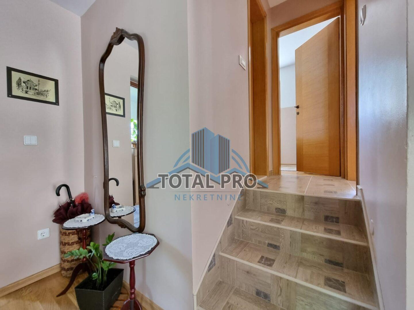PRIZEMLJE: Ulazni hodnik, kuhinja, trpezarija, dnevni boravak sa izlazom na terasu površine 24 m2, dvije spavaće sobe i kupatilo.