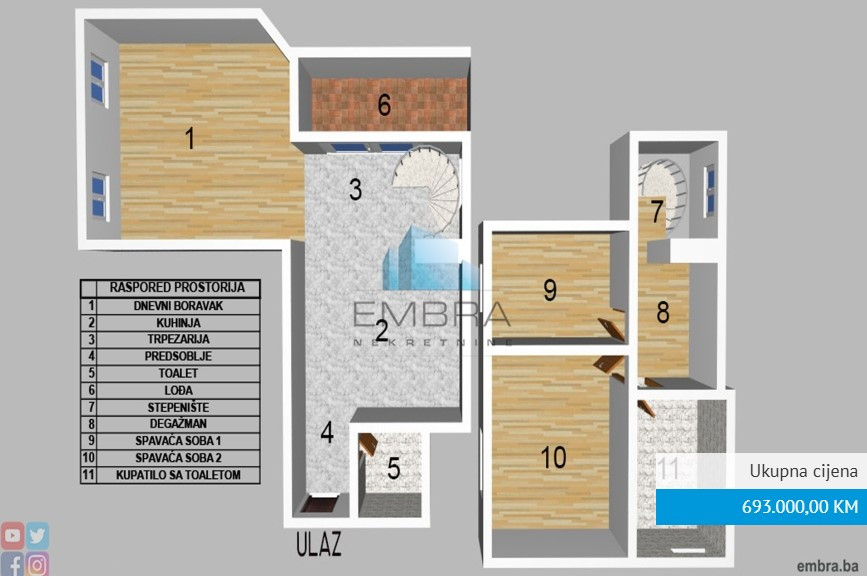 Sljedećeg je rasporeda, na prvoj etaži je: predsoblje, dnevni boravak, kuhinja sa trpezarijom, lođa i toalet, na drugoj etaži je: degažman, dvije spavaće sobe i kupatilo sa toaletom.