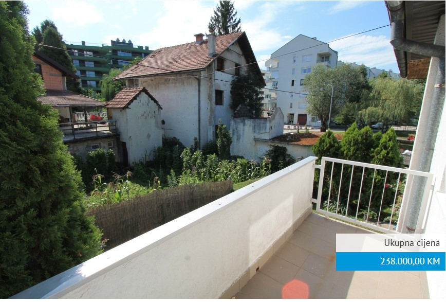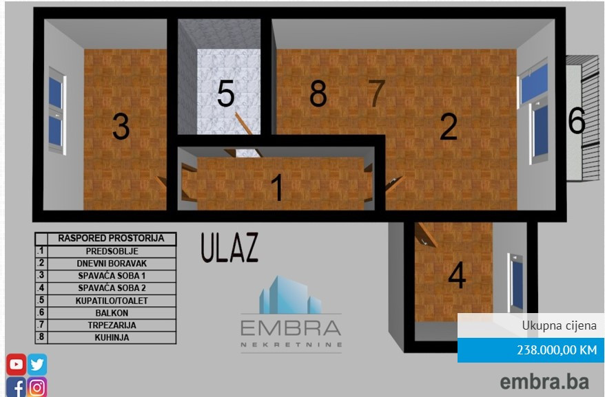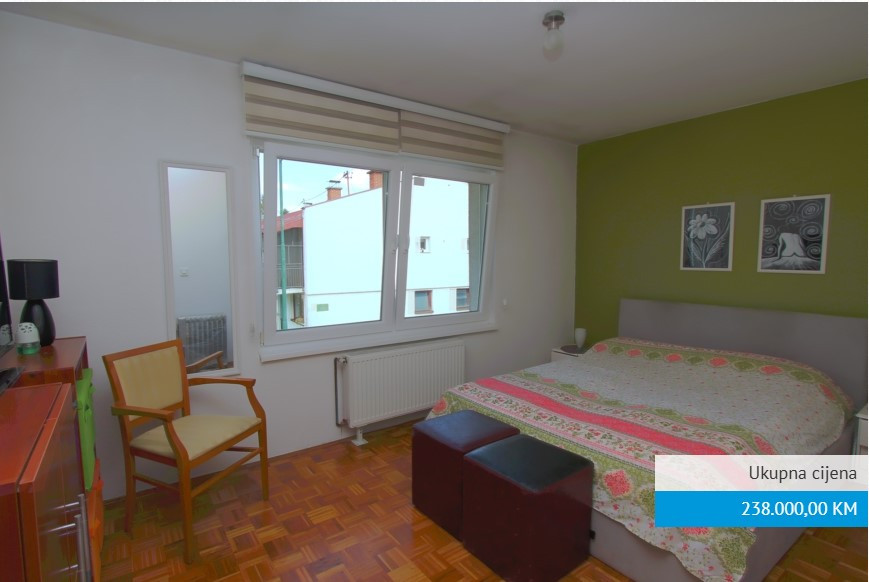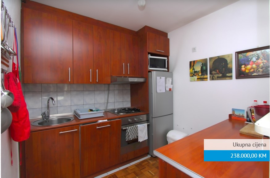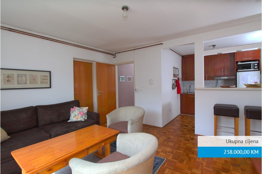 Nekretnina je sljedećeg rasporeda: predsoblje, dnevni boravak sa kuhinjom i trpezarijom, manja spavaća soba, velika spavaća soba, kuhinja sa trpezarijom, balkon i kupatilo sa toaletom.