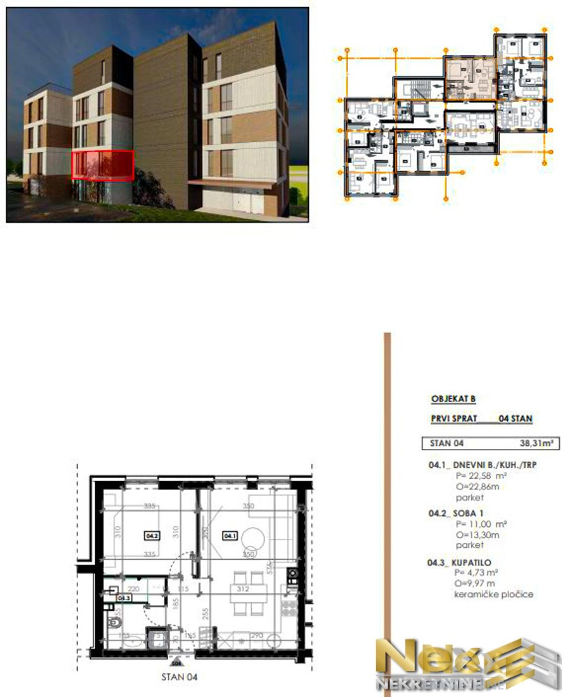 Stan se sastoji od: hodnika, kuhinje, dnevnog boravka sa trpezarijom, kupatila, i spavaće sobe.