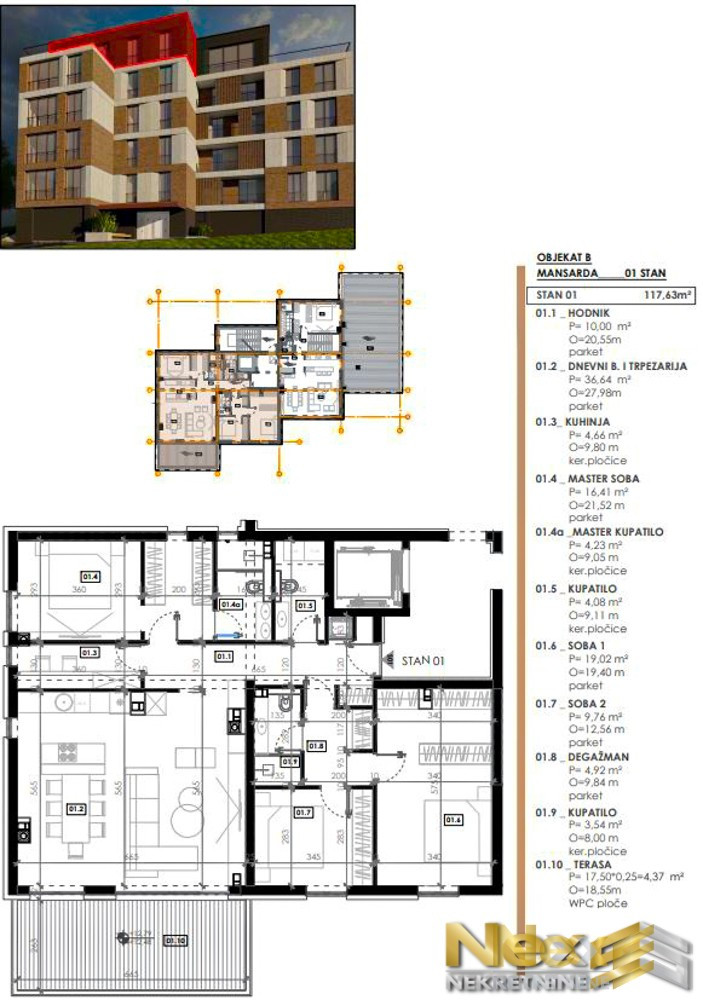 Iz ponude izdvajamo dvoetažni stan površine 117,63 m2, pozicioniran na mansardi, a koji se nalazi u Lameli B u prestižnom stambenom kompleksu „Breka Hills“, smještenom u mirnom i zelenilom okruženom dijelu Sarajeva, u ulici Breka, općina Centar. Kompleks je savršeno pozicioniran, izolovan od gradske gužve, a opet u neposrednoj blizini svih važnih sadržaja.