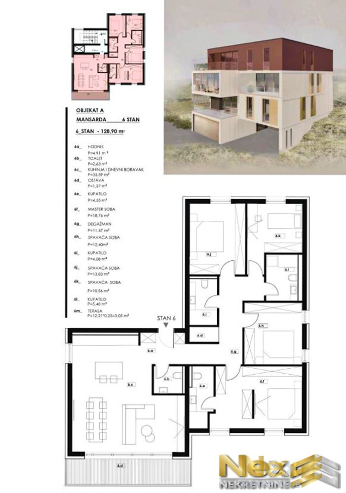 Stan se sastoji od: hodnika, kuhinje i dnevnog boravka, ostave, 3 kupatila i toaleta, degažmana, master sobe, 3 spavaće sobe i terase.