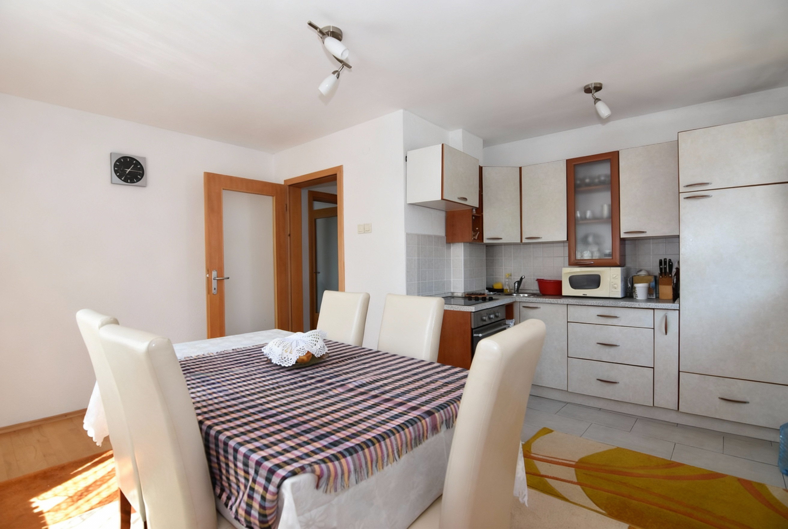 Prizemlje kuće se sastoji od ulaznog hodnika, male ostave, dnevnog boravka, izdvojene kuhinje sa trpezarijom, jedne spavaće sobe i kupatila. U prizemlju nekretnine izvan stambenog dijela nalaze se dvije ostave na suprotnim stranama od ulaza.