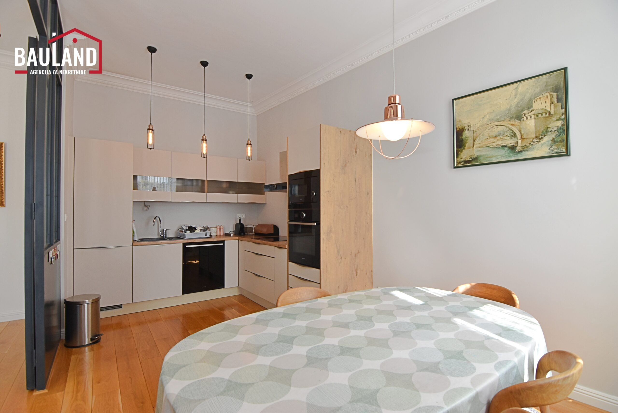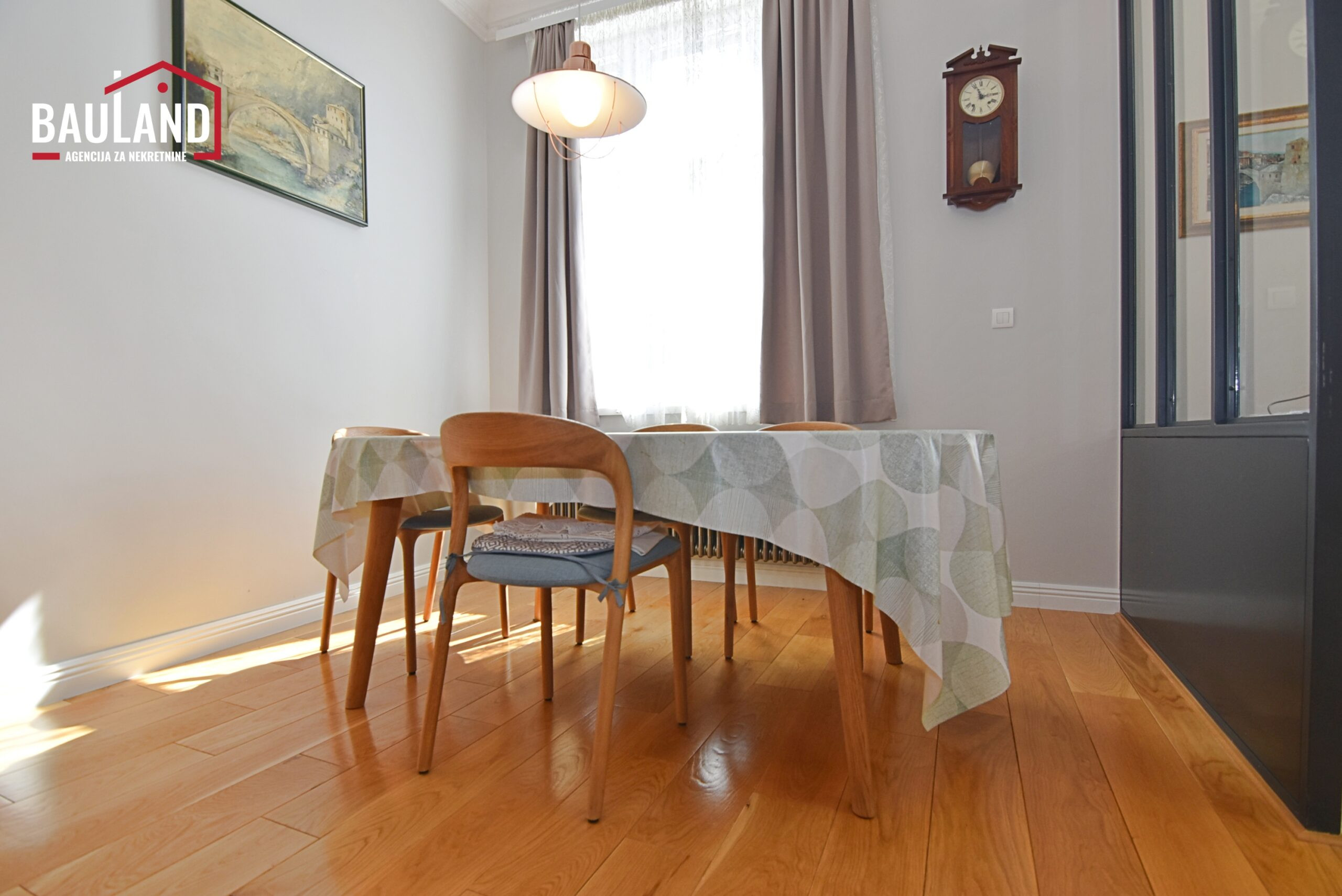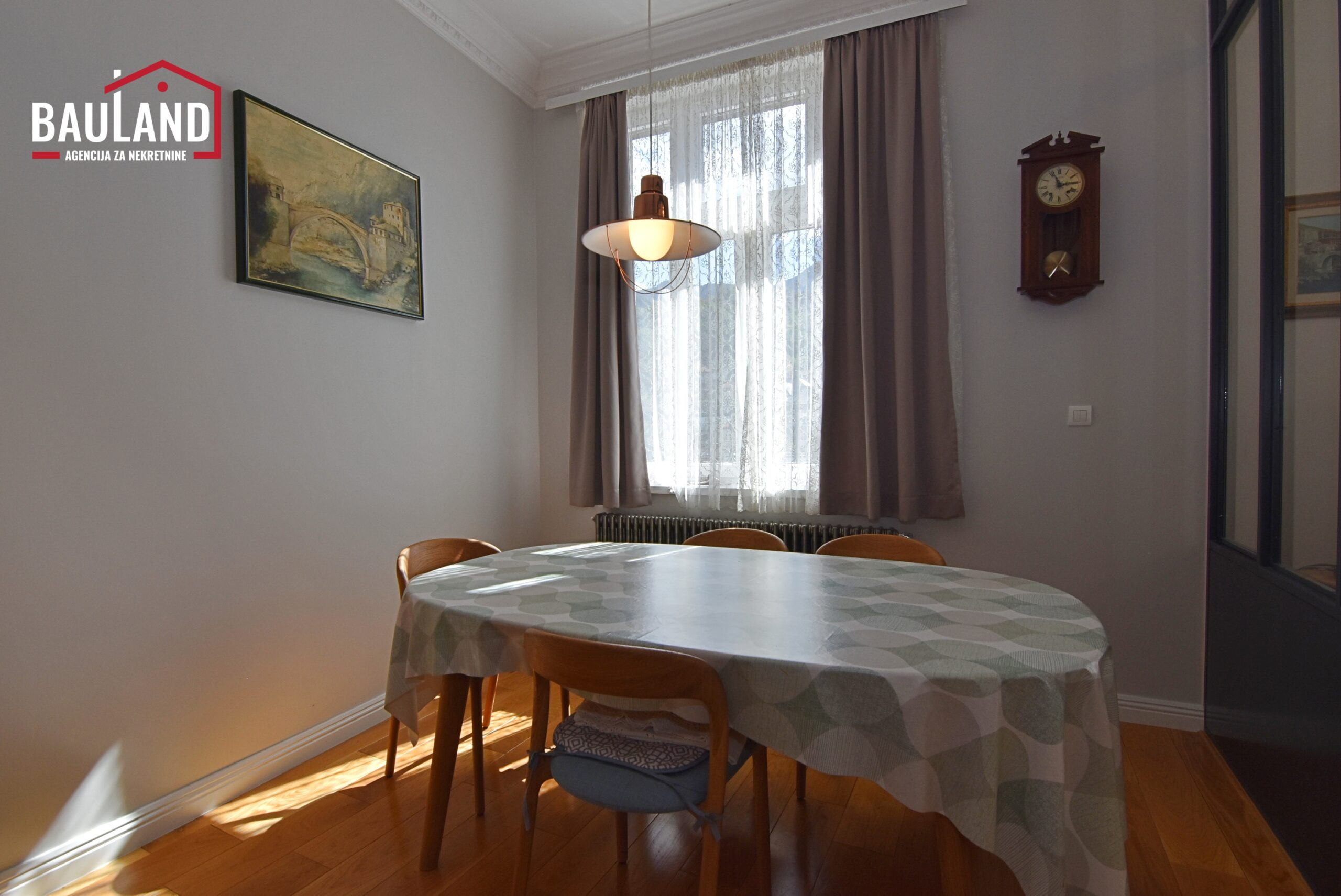 Lijepo namješten renoviran trosoban stan površine 106 m2 koji se nalazi na trećem spratu stambene zgrade bez lifta od ukupno četiri sprata u ulici Obala Kulina bana, preko puta mosta Drvenija u zgradi Slavija, Općina Stari Grad Sarajevo.