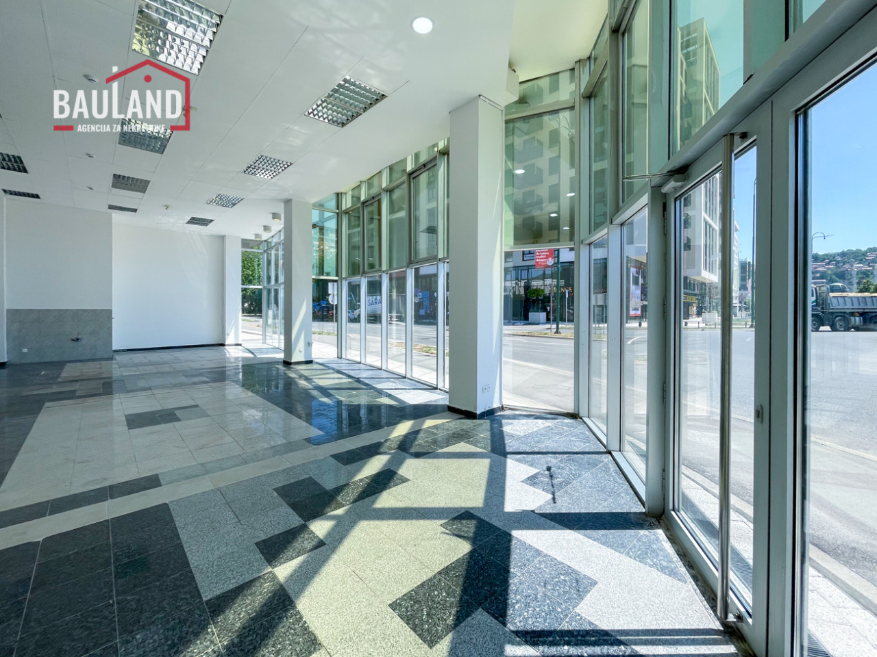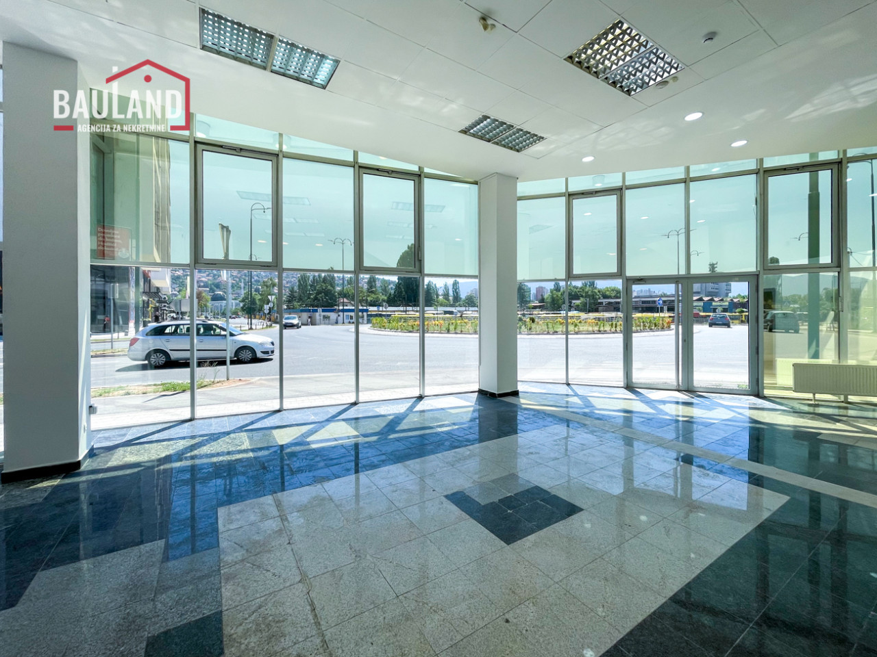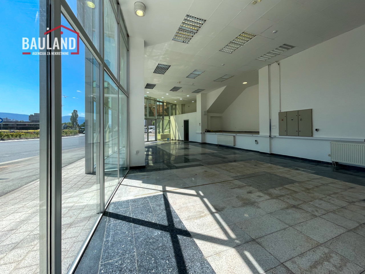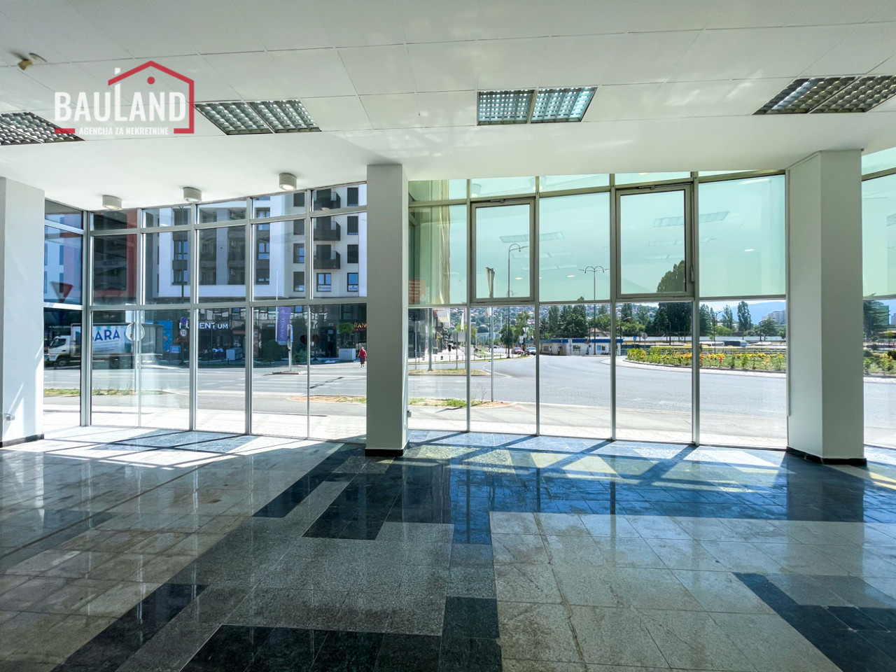 Prostor se nalazi u modernoj poslovnoj zgradi sa savremenom staklenom fasadom, pri čemu kompletna prednja strana – od poda do plafona – čini portal u punoj visini, što omogućava maksimalnu prirodnu osvijetljenost i snažan vizuelni utisak. Trenutno je u formi open-space koncepta, ali postoji mogućnost pregrađivanja i prilagodbe rasporeda prema potrebama zakupca, što dodatno povećava fleksibilnost korištenja.