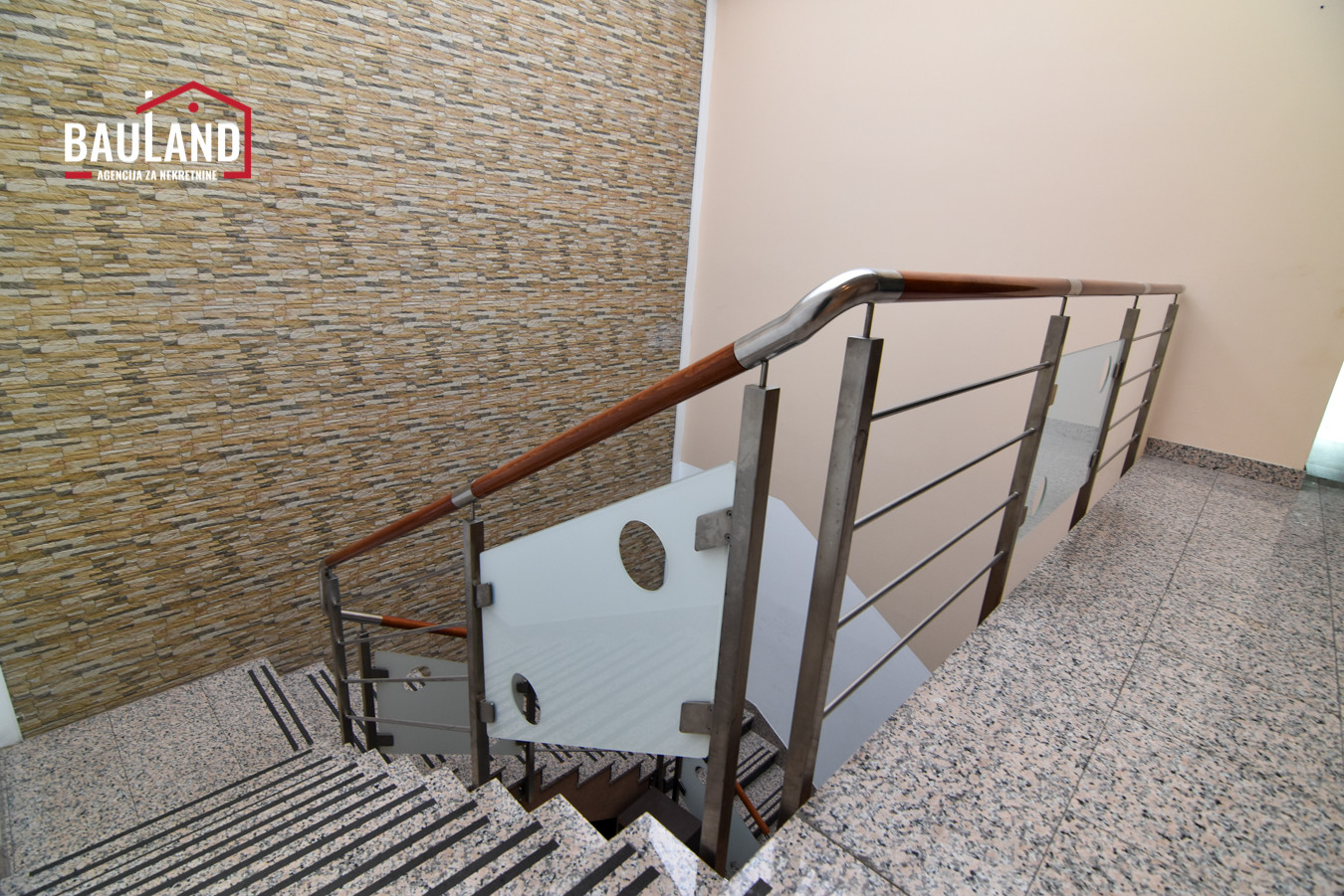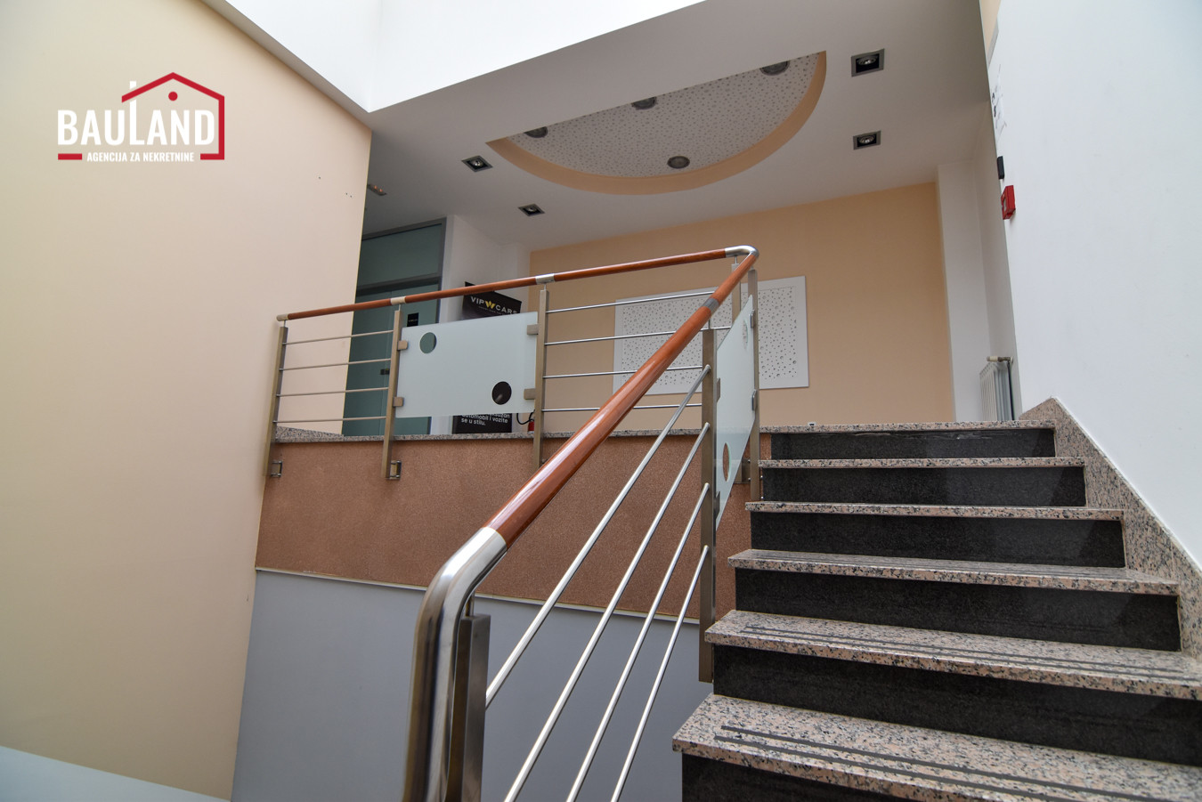 Poslovni objekat se sastoji od dvije etaže (Pr. + 1.) i čine ga centralni ulazni hol i stepenište te dva krila jednake površine i strukture.