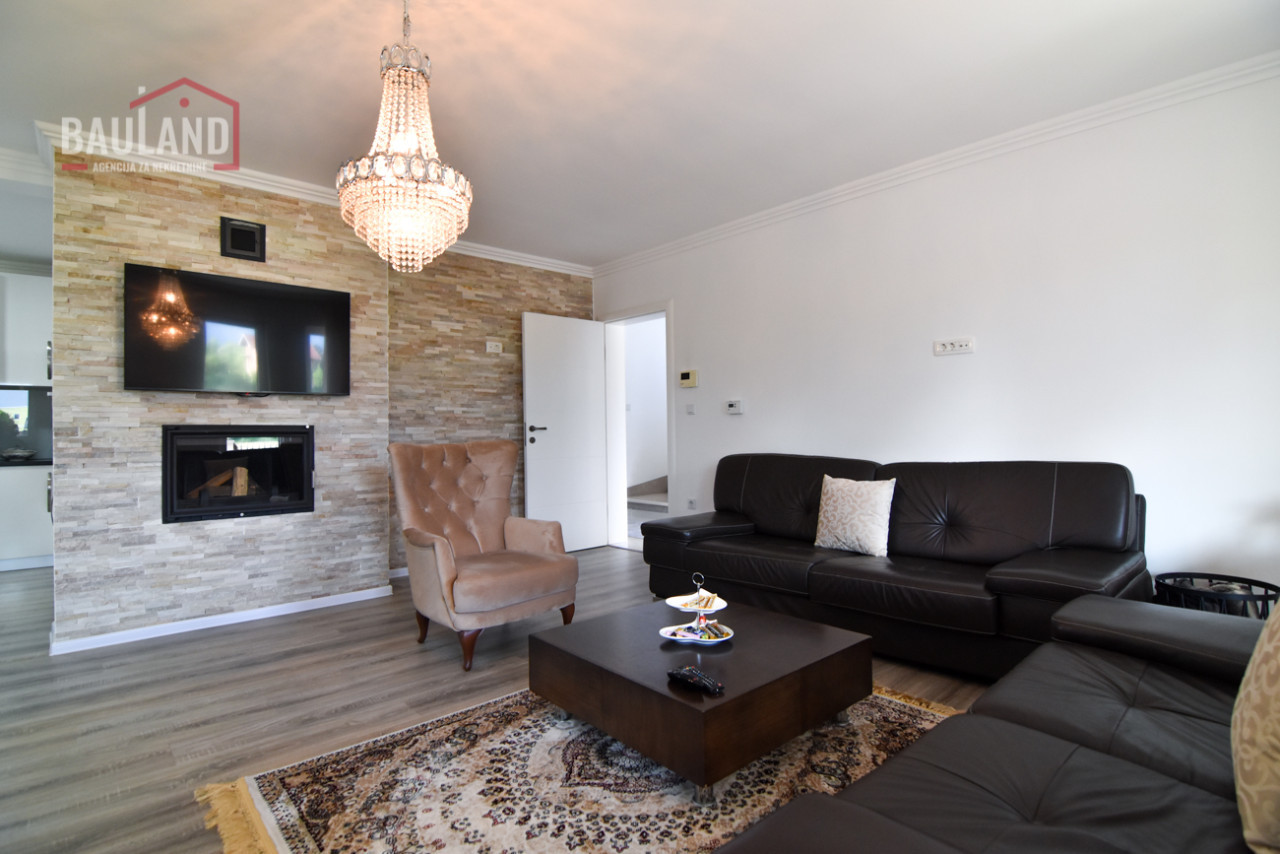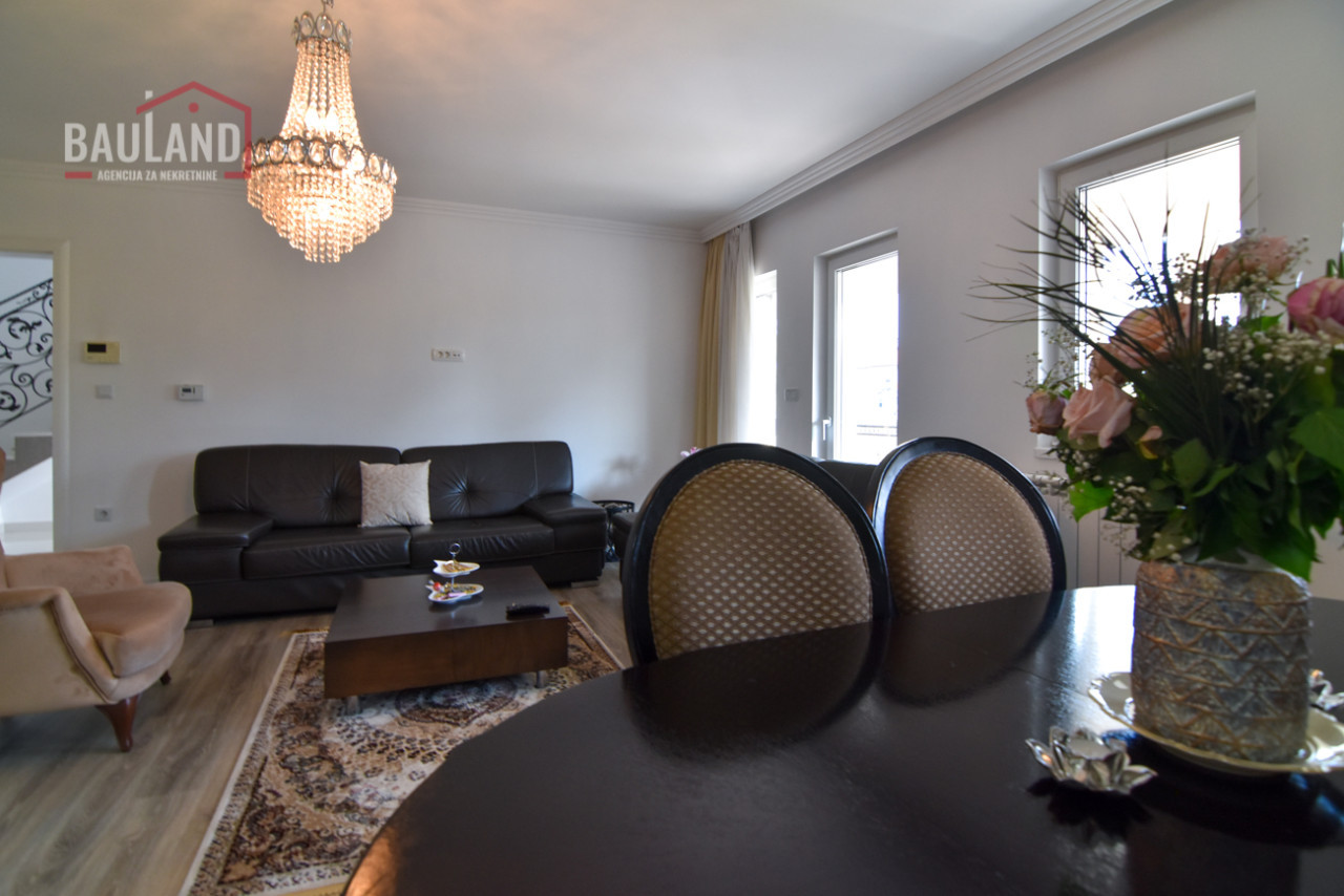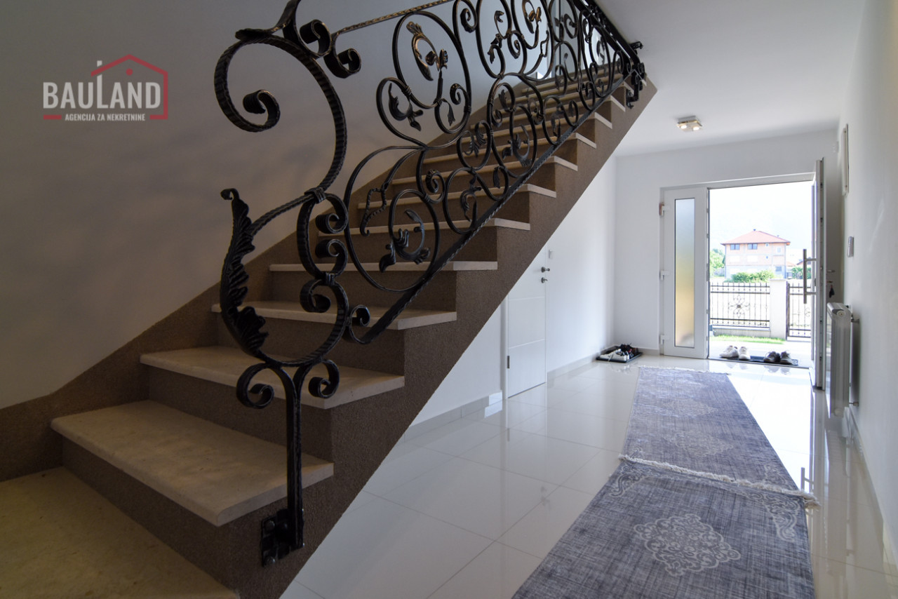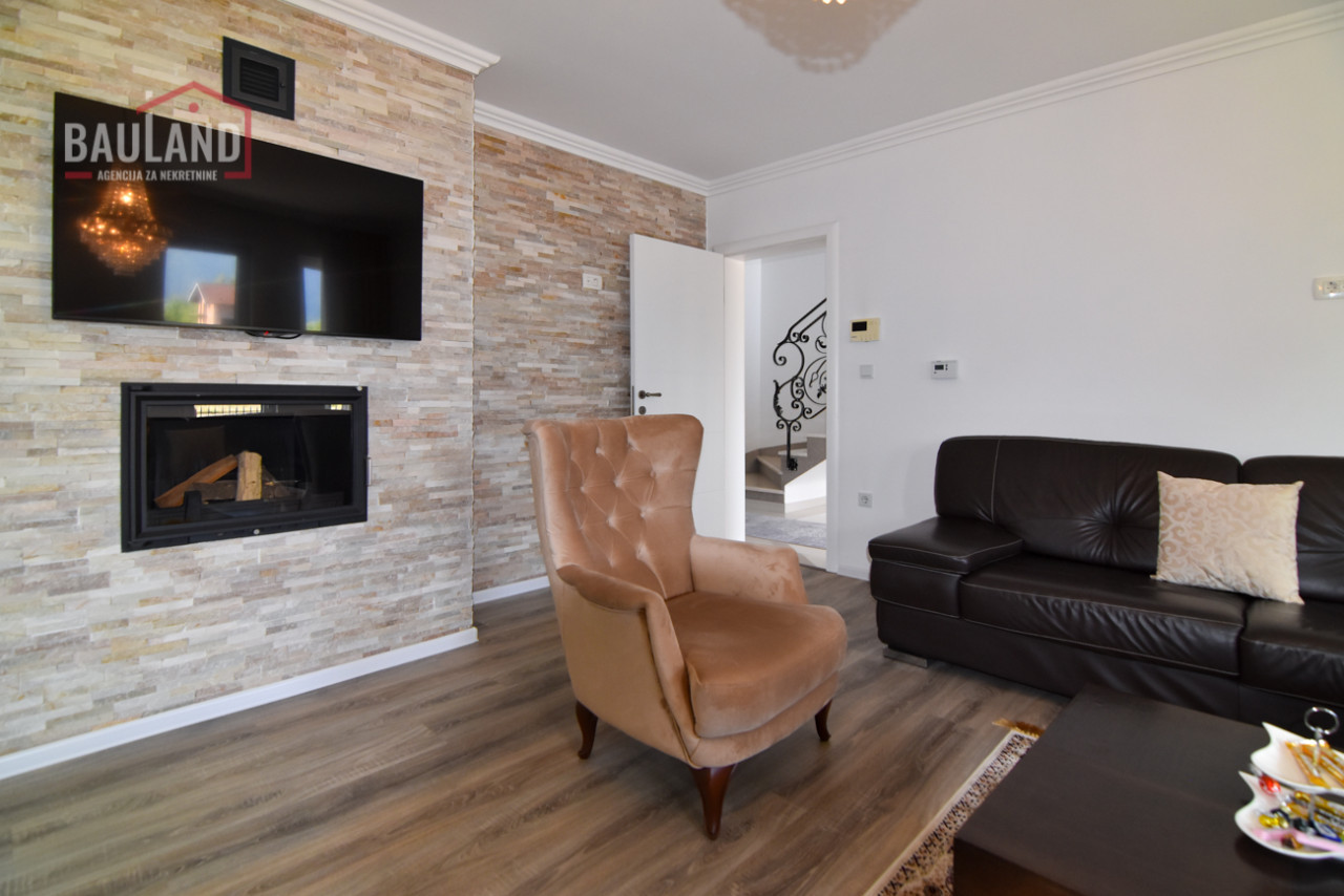 Kuća je kompletno namještena i opremljena svim potrebnim uređajima, uključujući inverter klima uređaje, savremene kuhinjske aparate, etažno plinsko grijanje te troslojnu vanjsku stolariju (Rehau) s odličnom toplotnom i zvučnom izolacijom. Posjeduje alarmni sistem, video nadzor, automatsku kapiju i uređeni privatni parking ispred kuće.