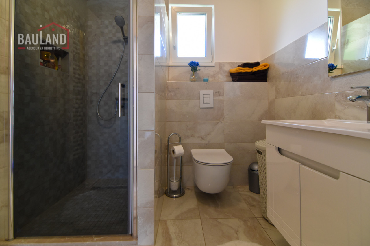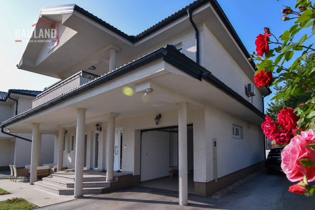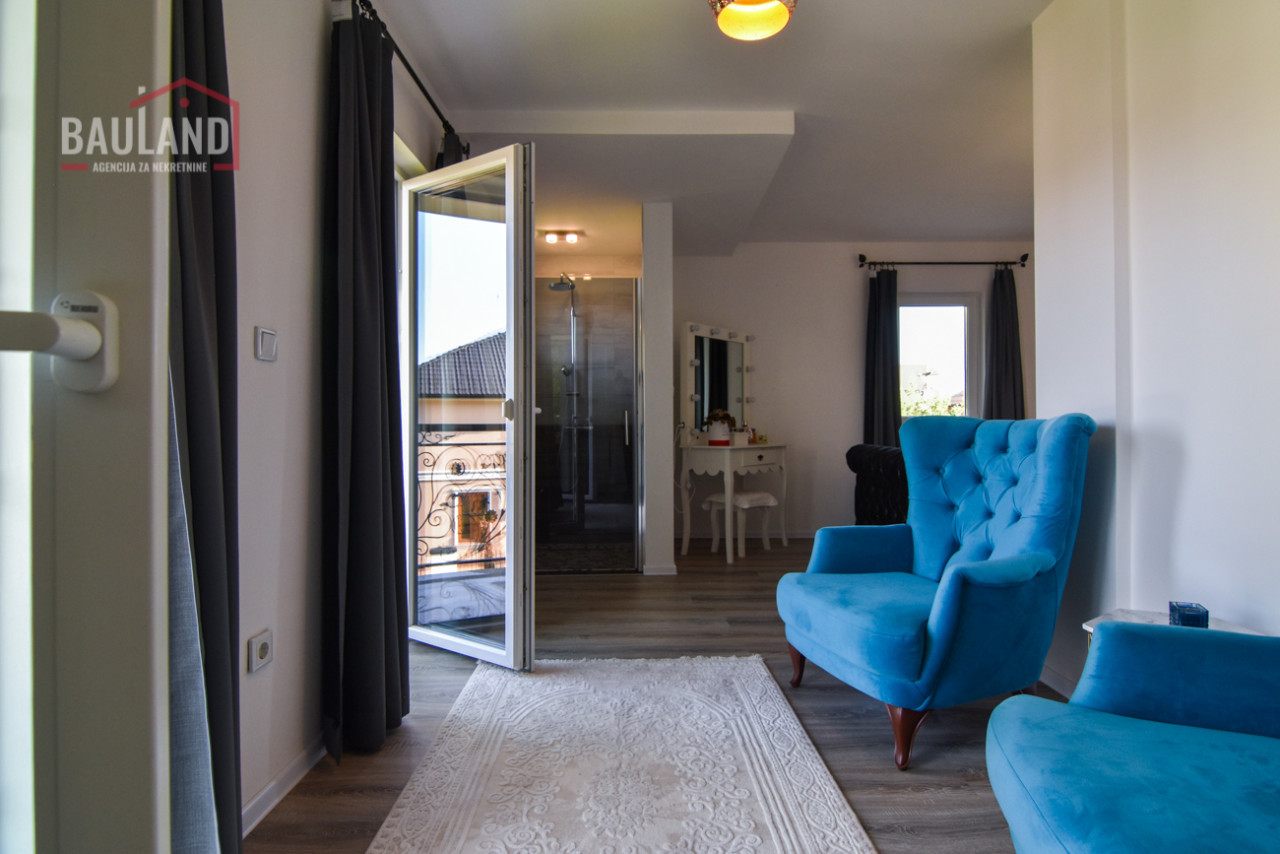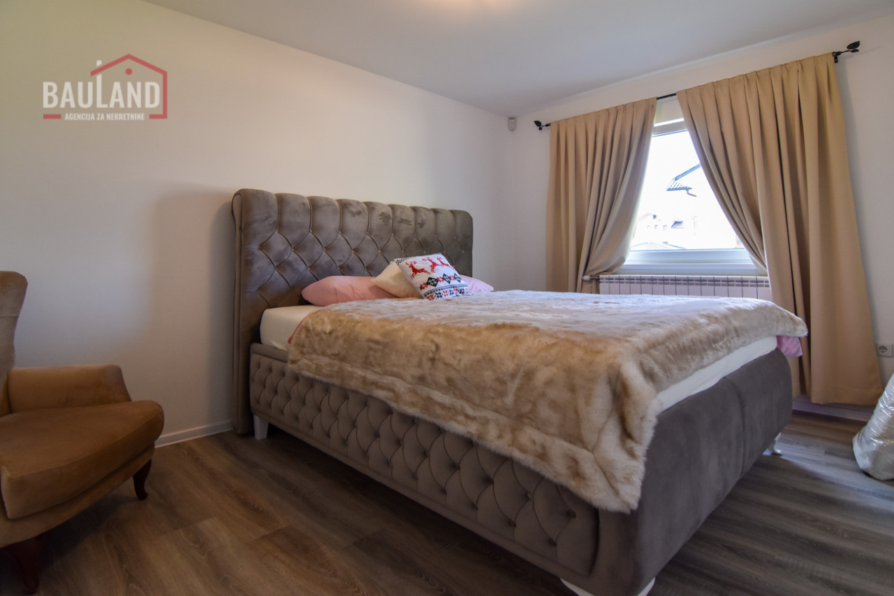 Kuća je kompletno namještena i opremljena svim potrebnim uređajima, uključujući inverter klima uređaje, savremene kuhinjske aparate, etažno plinsko grijanje te troslojnu vanjsku stolariju (Rehau) s odličnom toplotnom i zvučnom izolacijom. Posjeduje alarmni sistem, video nadzor, automatsku kapiju i uređeni privatni parking ispred kuće.
