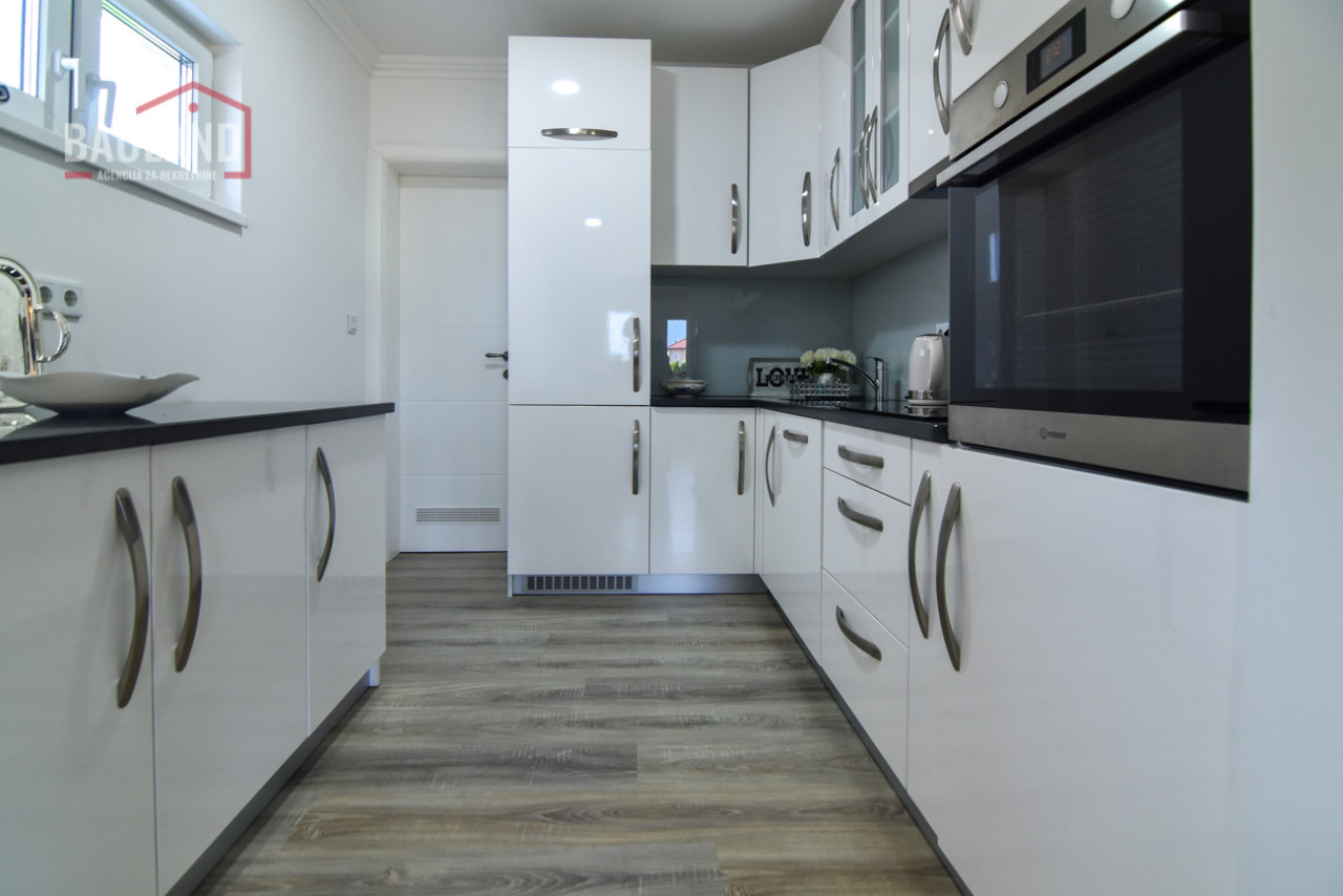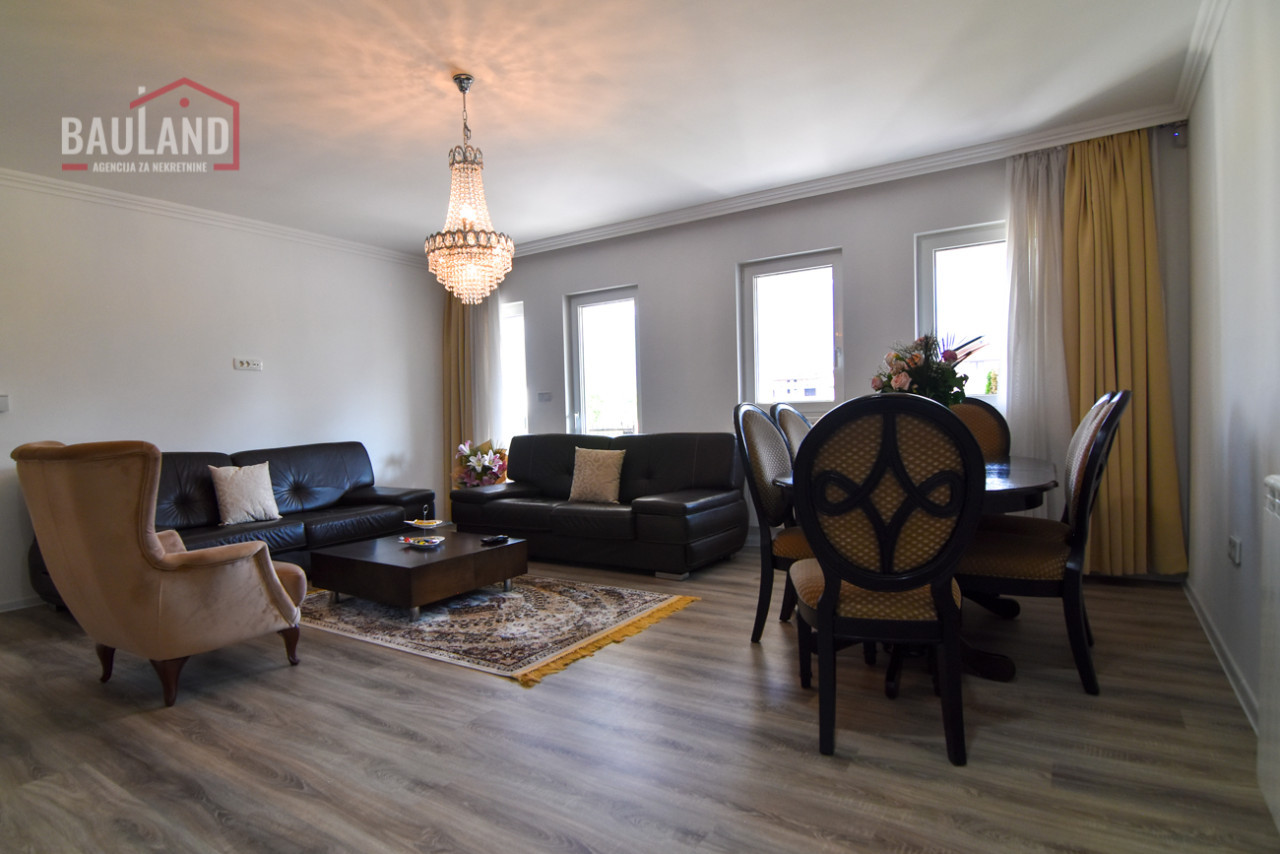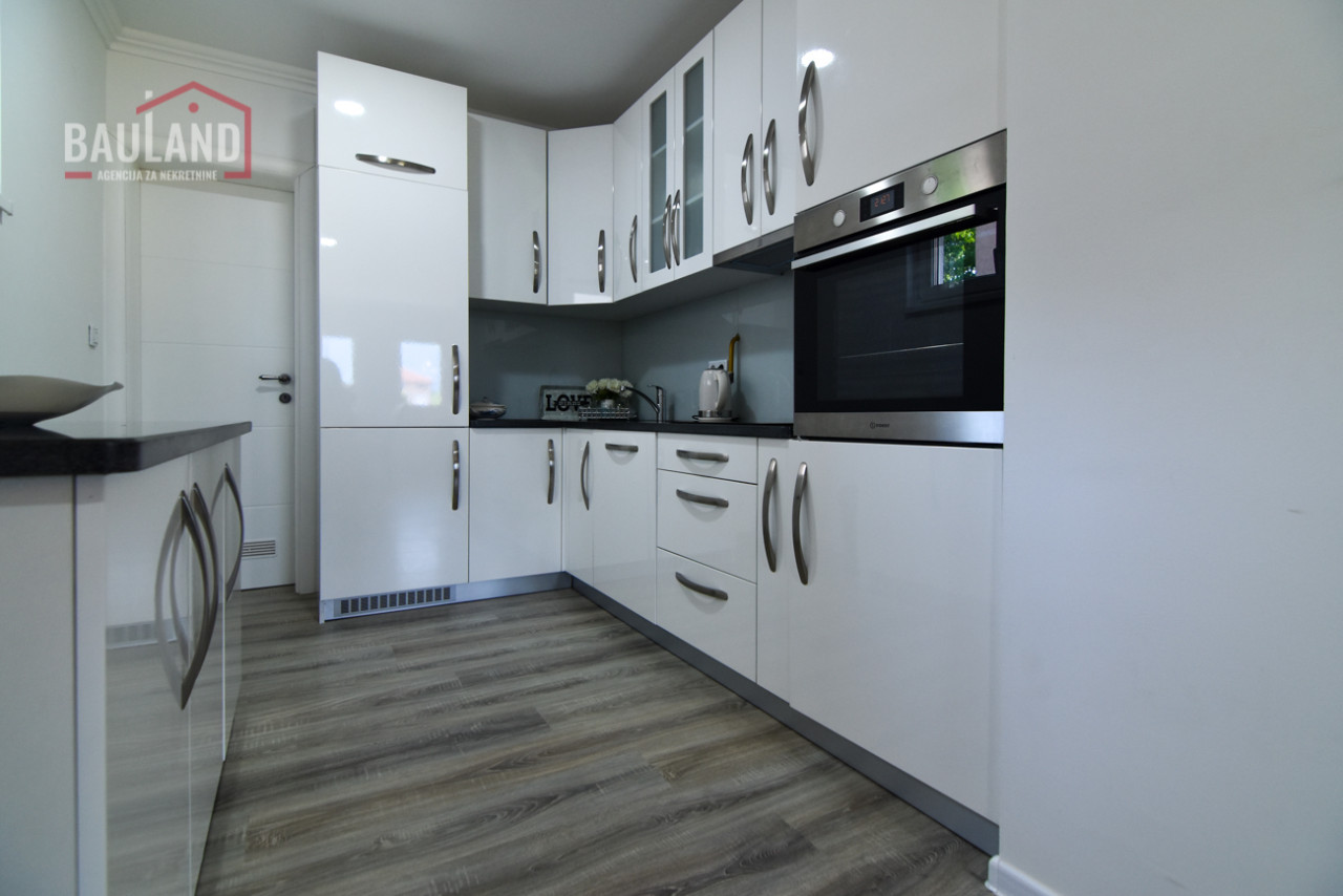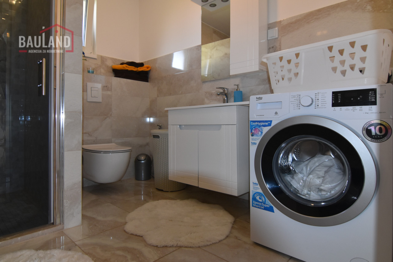 Kuća je kompletno namještena i opremljena svim potrebnim uređajima, uključujući inverter klima uređaje, savremene kuhinjske aparate, etažno plinsko grijanje te troslojnu vanjsku stolariju (Rehau) s odličnom toplotnom i zvučnom izolacijom. Posjeduje alarmni sistem, video nadzor, automatsku kapiju i uređeni privatni parking ispred kuće.