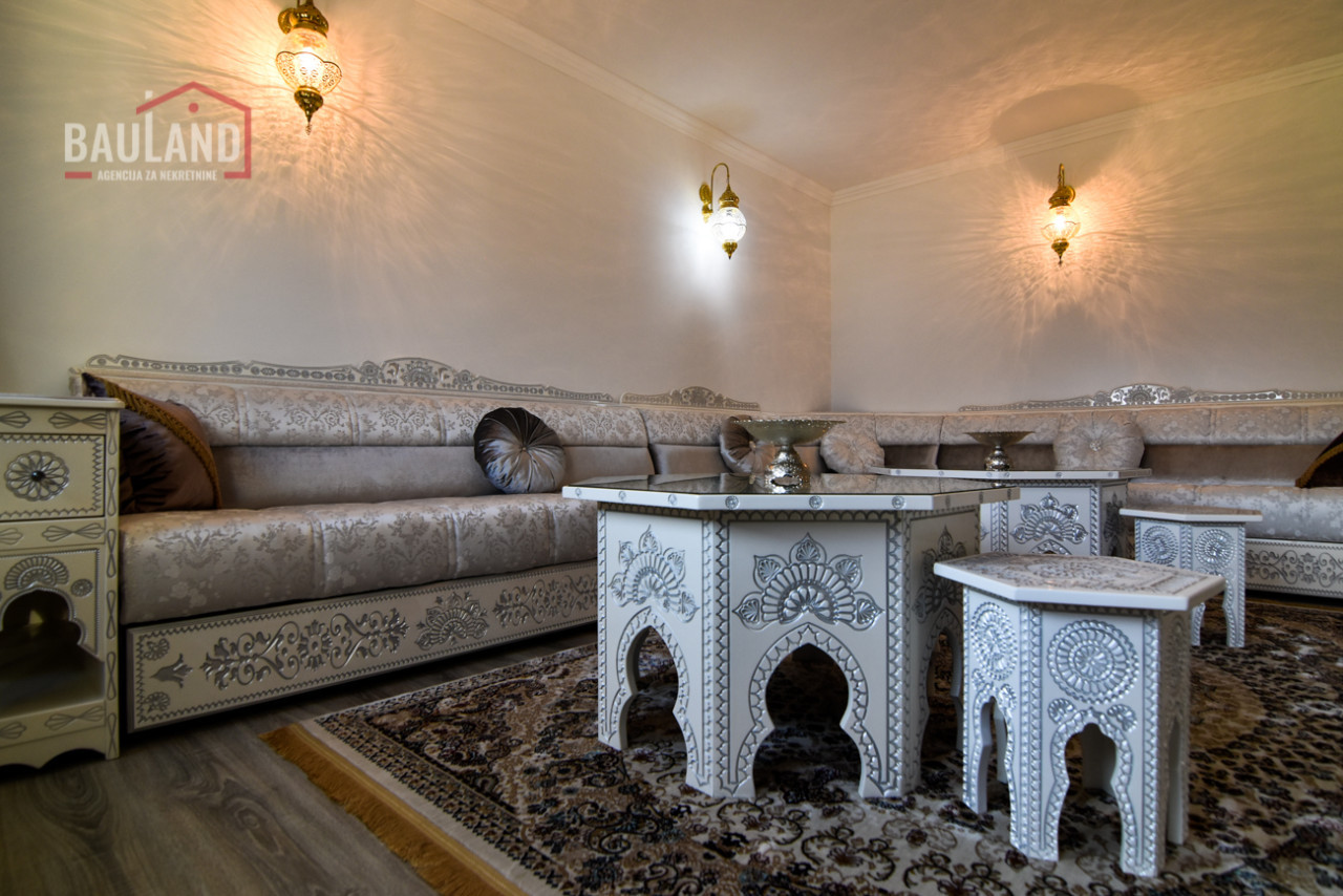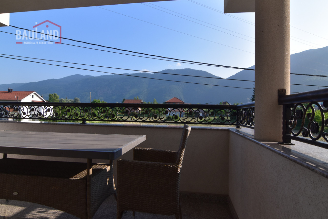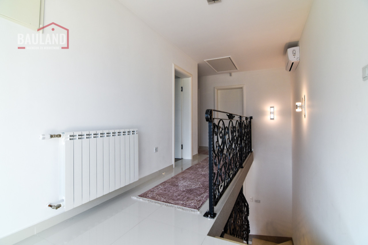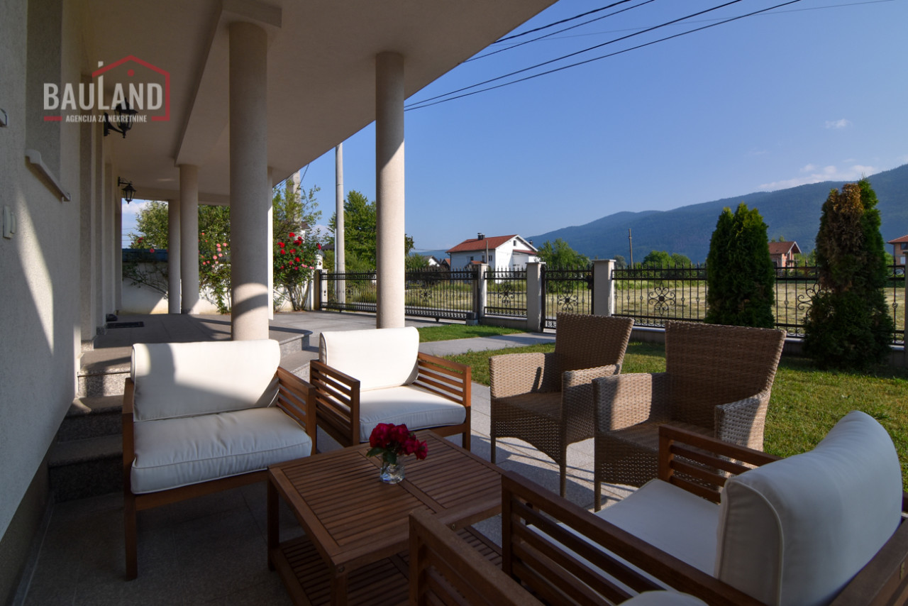 Nekretnina se sastoji od dvije etaže – prizemlja i sprata. U prizemlju se nalazi prostrani dnevni boravak povezan s kuhinjom i trpezarijom, jedna spavaća soba opremljena bračnim krevetom i ormarom, moderno kupatilo, garaža sa daljinskim upravljanjem, kotlovnica te terasa s izlazom na njegovani vrt. Unutrašnje mermerno stubište sa kovanom ogradicom vodi na sprat gdje se nalaze: tradicionalno uređena gostinska soba u bosanskom stilu, master spavaća soba sa vlastitim kupatilom i izlazom na balkon, dodatne dvije spavaće sobe, kupatilo i velika terasa s koje se pruža očaravajući pogled na prirodni ambijent i planinu Igman.