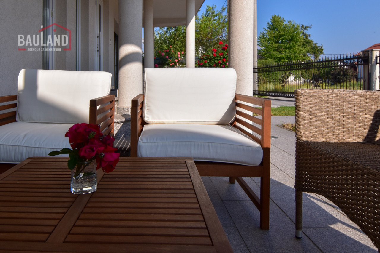 Dvorište je ograđeno kovanom ogradom i okruženo prelijepim zelenilom, s pažljivo uređenim travnjakom koji se redovno održava. Cijelo okruženje odiše luksuzom i privatnošću, s izuzetno kvalitetnim komšilukom.