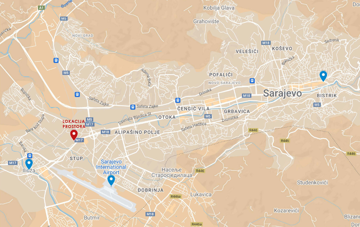 Poslovni prostor se nalazi na odličnoj lokaciji, u ulici Pijačna, naselje Stup. Lokacija je izuzetno bogata raznovrsnim sadržajima, a sam objekat odlikuje se izvrsnim pristupom i visokom vidljivošću s glavne saobraćajnice, što je marketinški vrlo atraktivna pozicija. Javni gradski saobraćaj ovu lokaciju odlično povezuje sa ostalim dijelovima grada. Objekat je udaljen svega 15 minuta od centra grada, u neposrednoj blizini niza poslovnih zgrada i aerodroma.