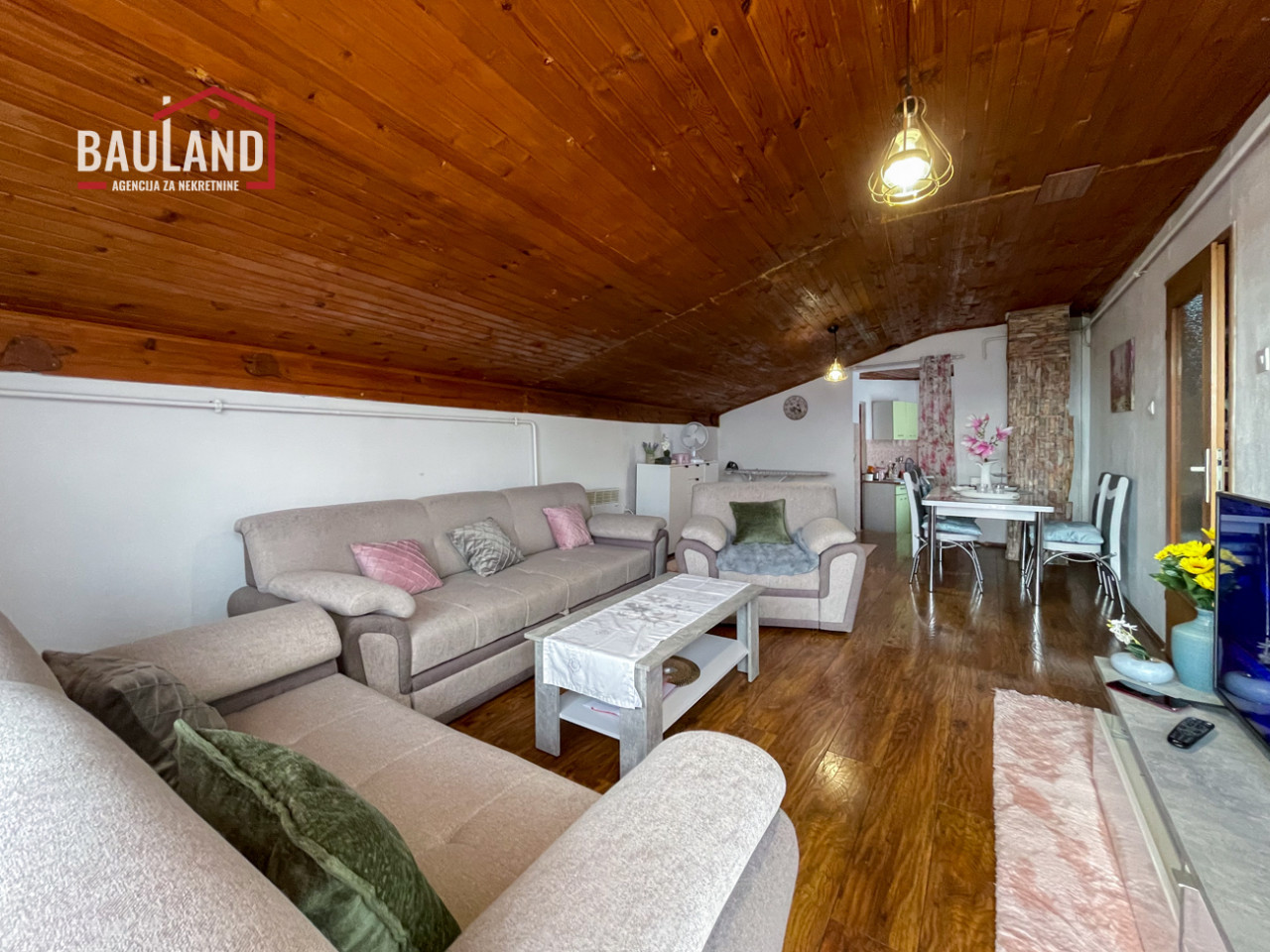 Sprat kojem se pristupa vanjskim stepenicama sastoji se od hodnika, dnevnog boravka s izlazom na balkon, kuhinje, trpezarije, dvije spavaće sobe i kupatila. Podovi su laminat i keramika, dok je stolarija također drvena.