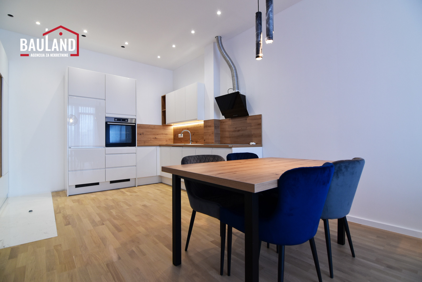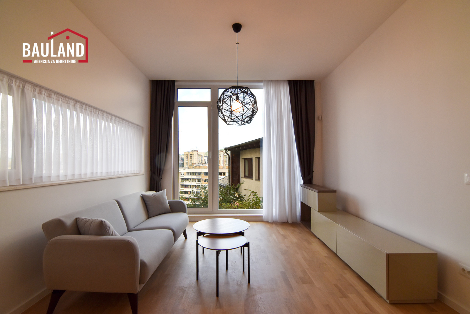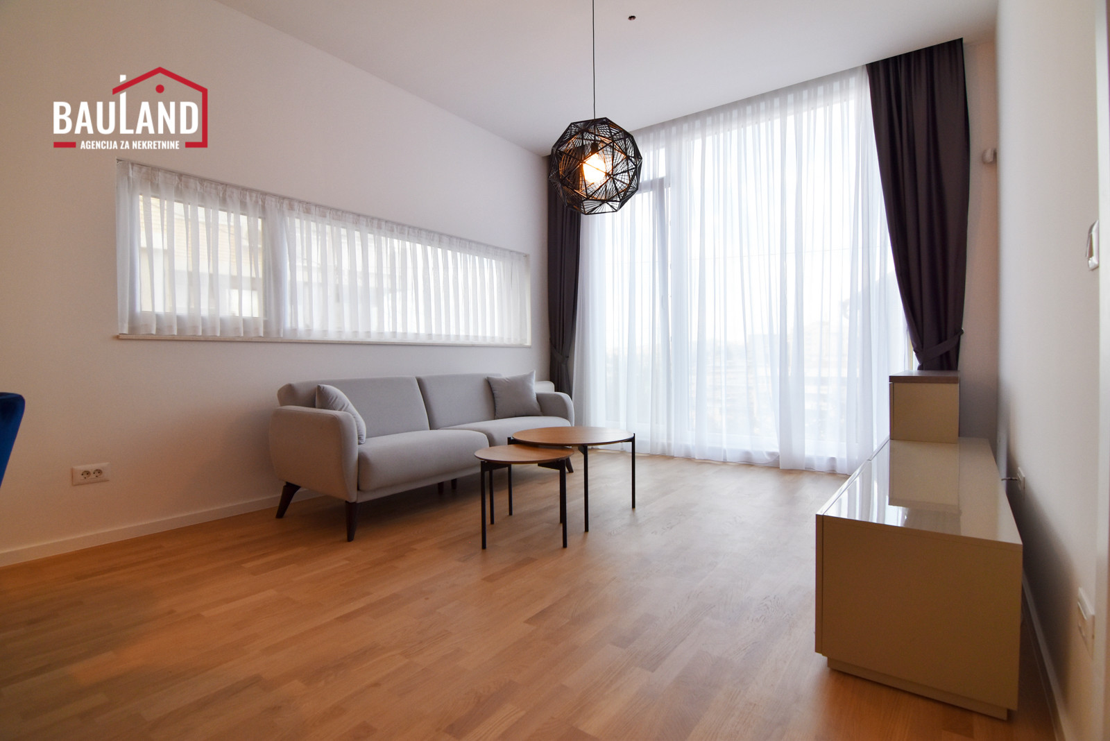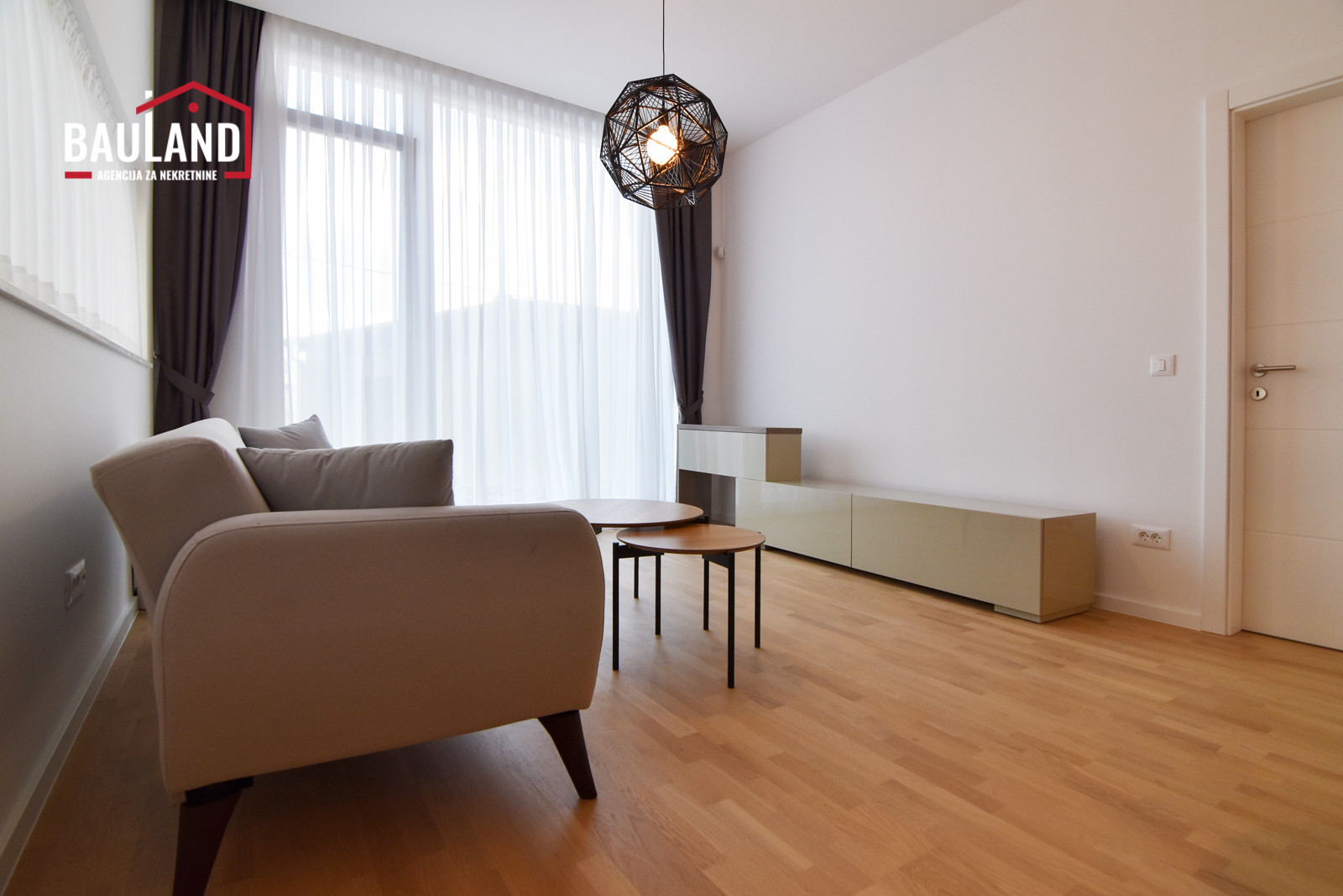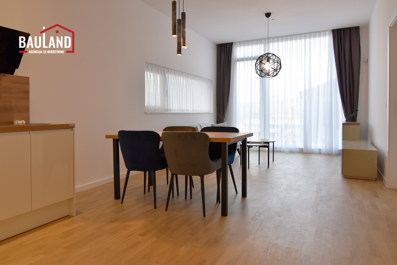 Namješten je savremenim i funkcionalnim namještajem, te opremljen svim potrebnim kućanskim aparatima uključujući klima uređaj, čime je zakupcima osiguran visok nivo udobnosti. Posebnu atraktivnost stanu daje “open space” koncept dnevnog boravka i kuhinje, dodatno naglašen velikim staklenim portalima koji prostoru pružaju obilje prirodne svjetlosti.
