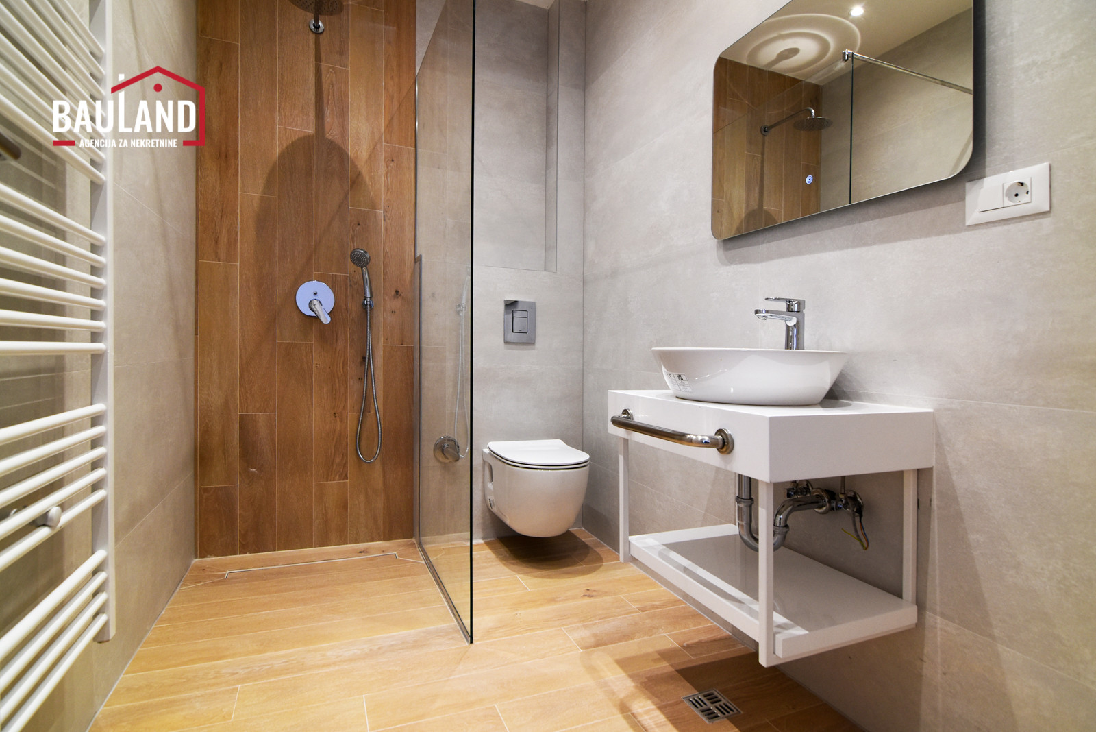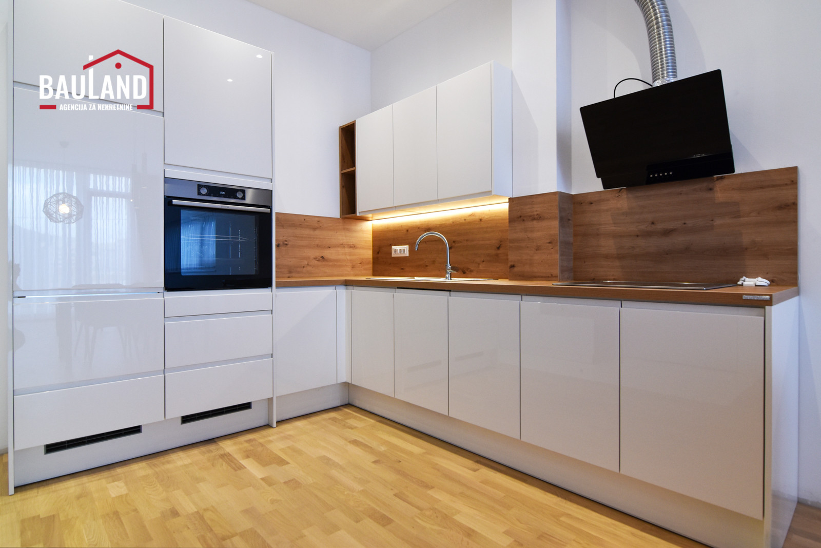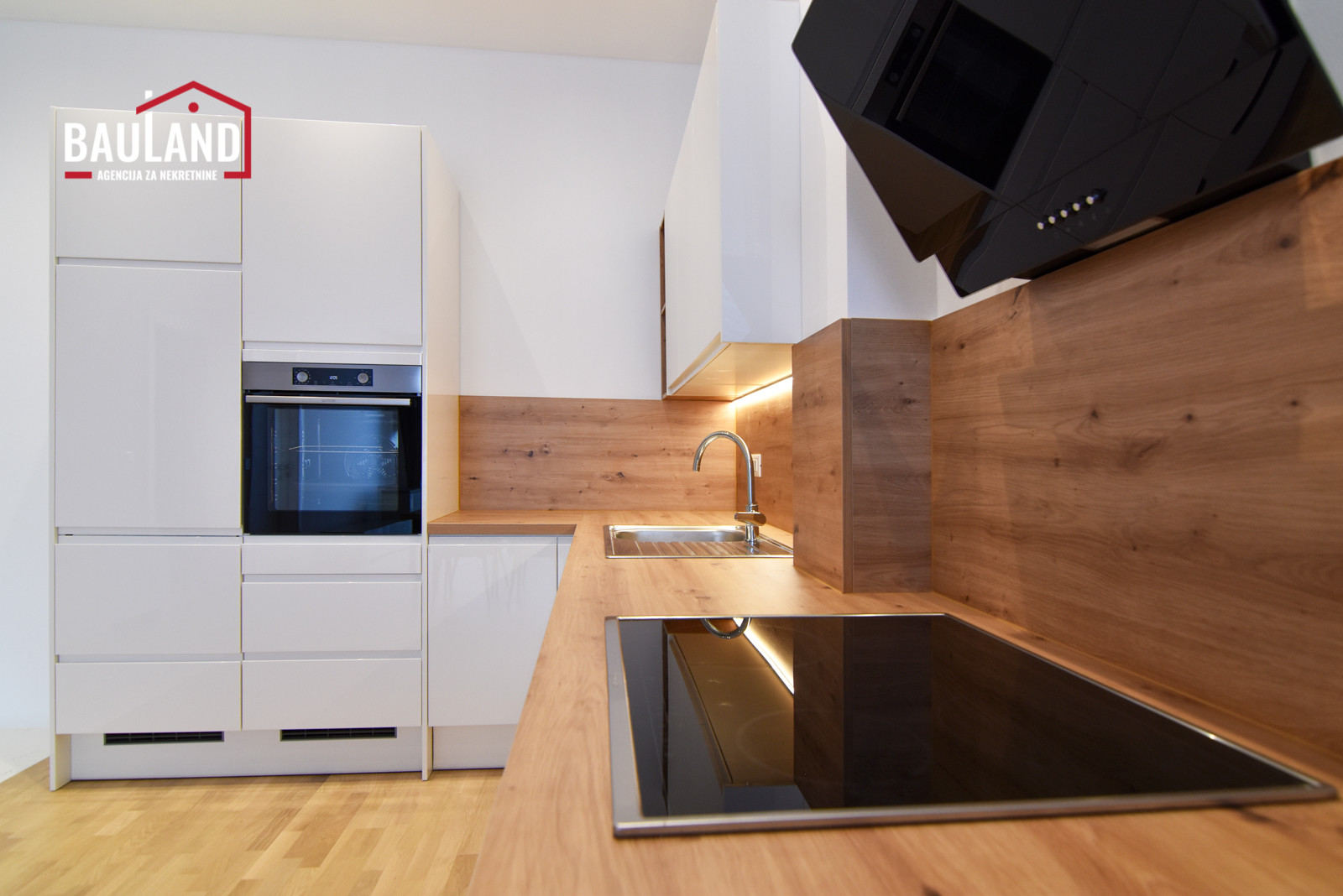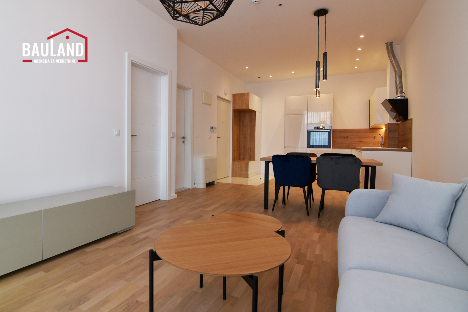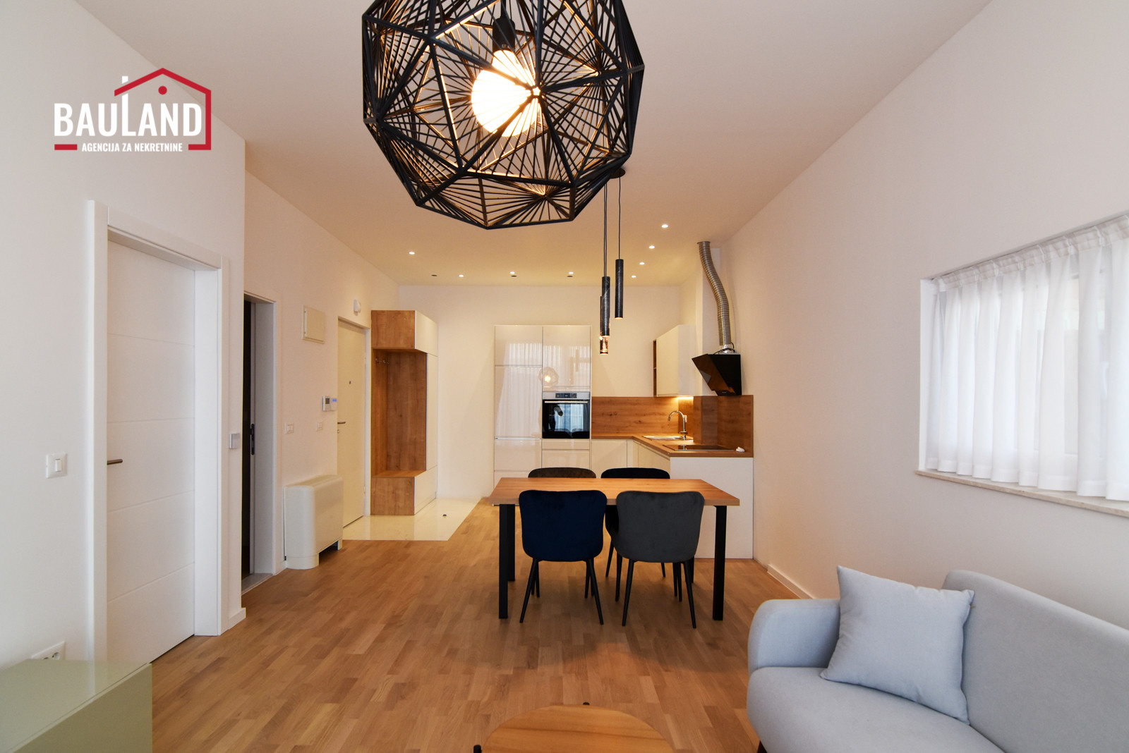 Namješten je savremenim i funkcionalnim namještajem, te opremljen svim potrebnim kućanskim aparatima uključujući klima uređaj, čime je zakupcima osiguran visok nivo udobnosti. Posebnu atraktivnost stanu daje “open space” koncept dnevnog boravka i kuhinje, dodatno naglašen velikim staklenim portalima koji prostoru pružaju obilje prirodne svjetlosti.